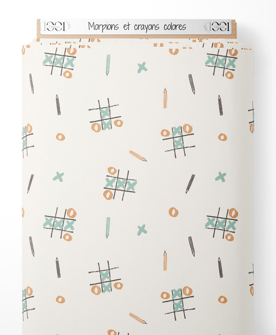 Symboles X et O dans des grilles de morpion. Petits cercles orange et croix vertes ajoutent des détails ludiques.Les tissus