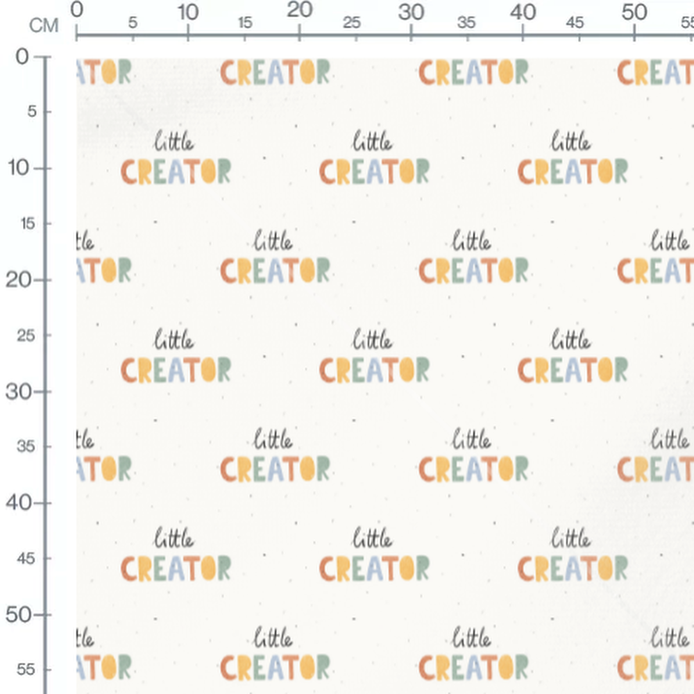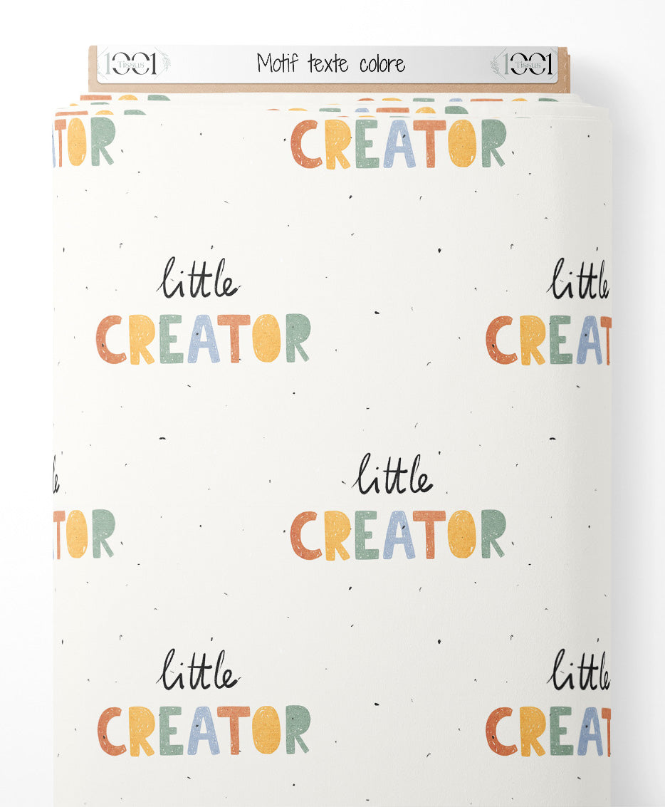Les lettres du mot 'CREATOR' sont en orange, bleu, vert et jaune. Le mot 'little' est écrit en noir avec une police manuscrite.Les tissus