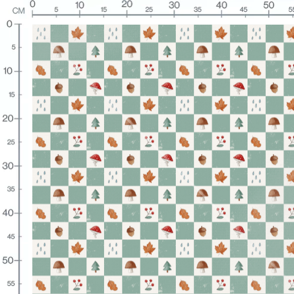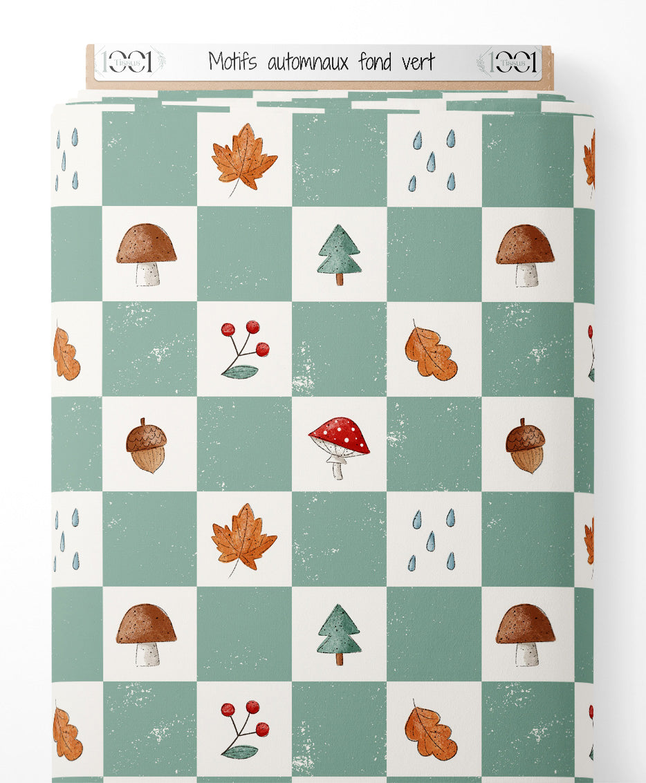 Glands et feuilles d'automne sur fond vert. Champignons rouges et marron sur fond vert. Petites gouttes de pluie bleues sur fond vert.Les tissus
