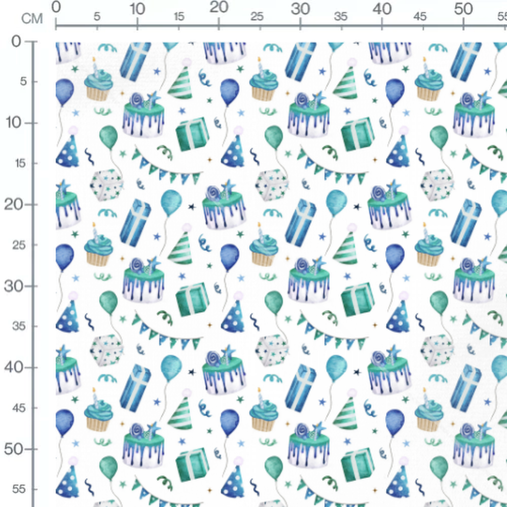 Les gâteaux sont décorés de glaçage bleu et vert avec des bougies. Les ballons sont de différentes nuances de bleu et vert. Les cadeaux sont ornés de motifs étoilés et rayés. Les chapeaux de fête présentent des motifs à pois et rayures. Les guirlandes ajoutent une touche festive avec des triangles colorés.Les tissus