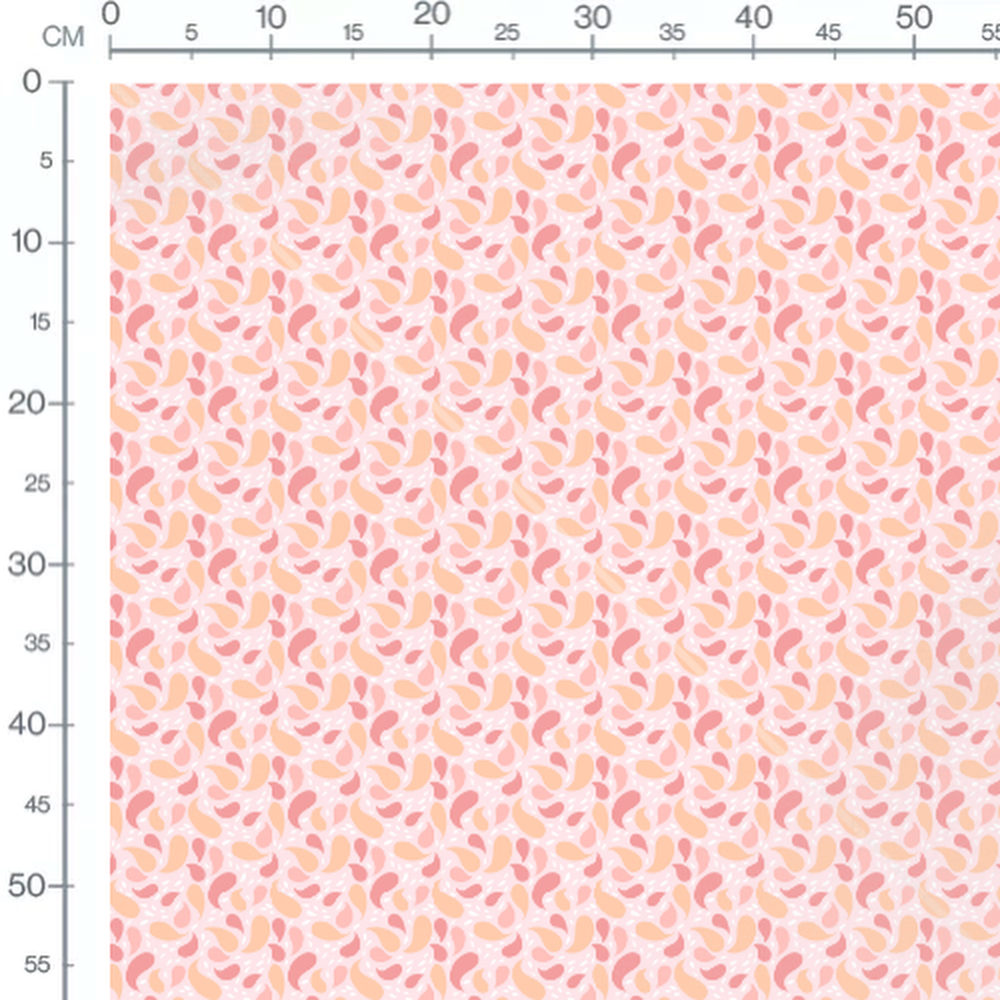 Les motifs floraux sont arrondis et variés en taille. Les couleurs dominantes sont le rose et le pêche, créant un effet doux et harmonieux.Les tissus