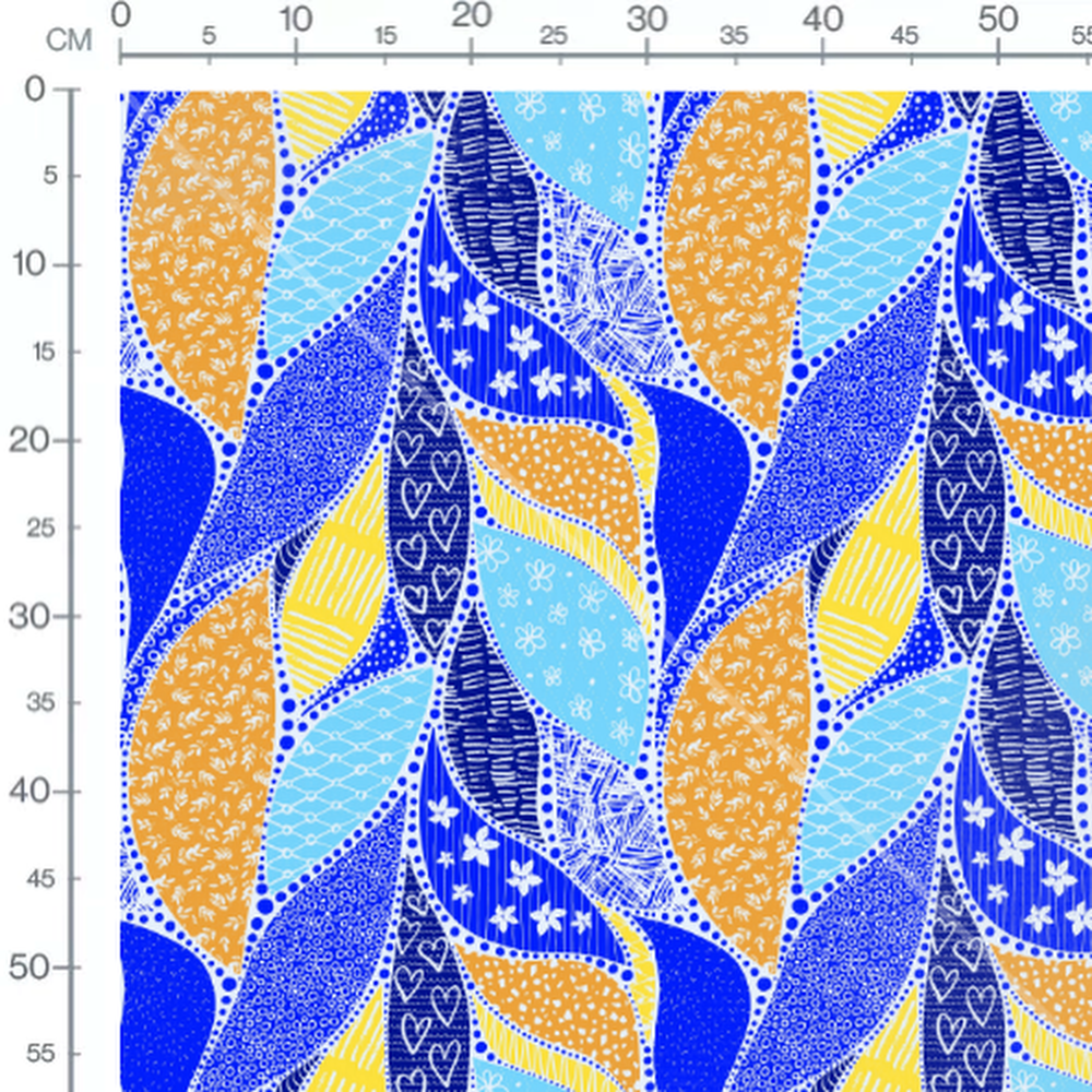 Les motifs incluent des fleurs blanches sur fond bleu et des cœurs blancs sur fond bleu foncé. Des lignes blanches croisées sur fond bleu clair et des motifs floraux sur fond orange. Des points et des traits blancs sur fond bleu et jaune complètent le design.Les tissus