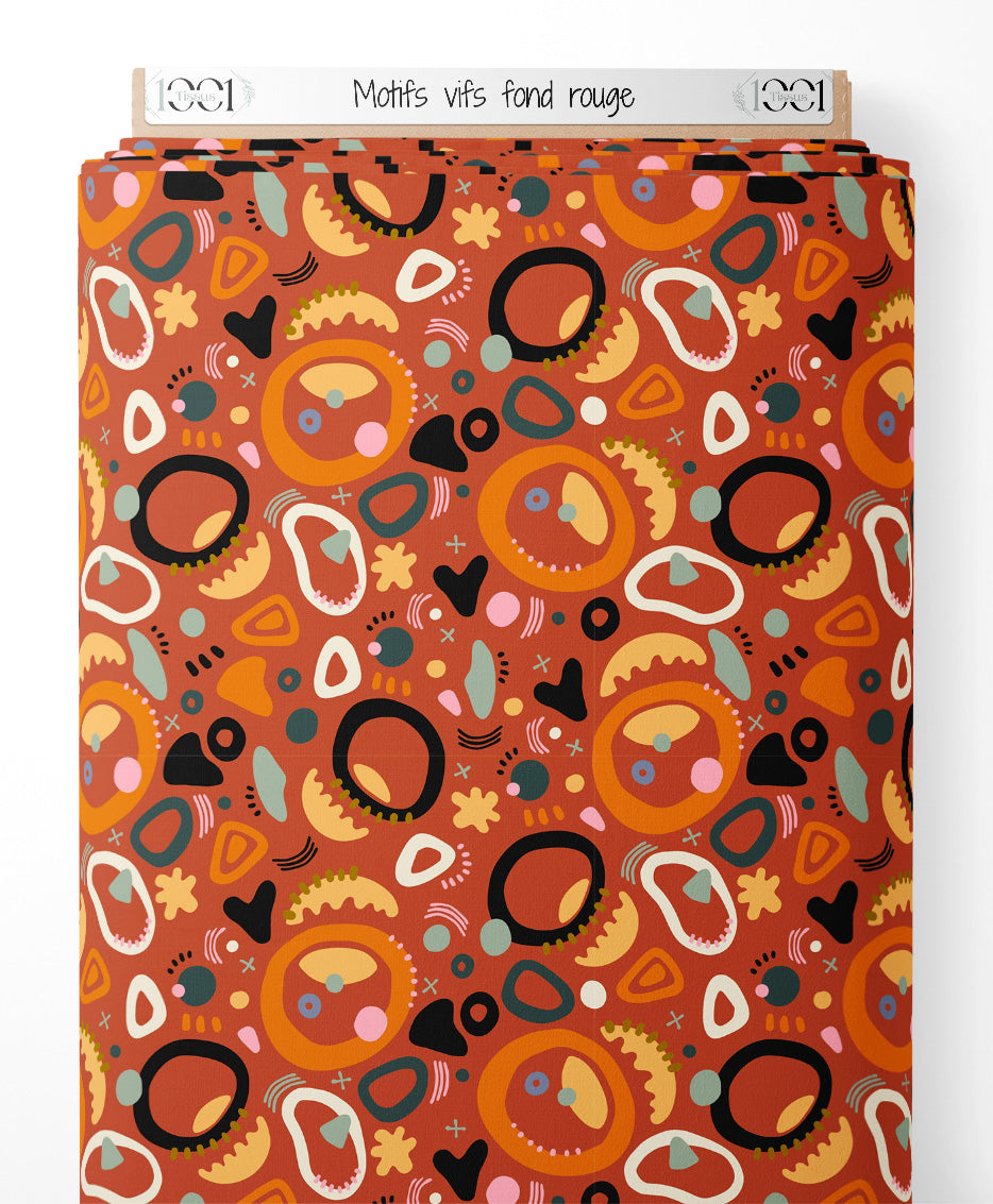 Les formes incluent des cercles, des arcs et des lignes ondulées. Les couleurs vives contrastent avec le fond rouge. Des touches de blanc et de gris ajoutent de la variété.Les tissus