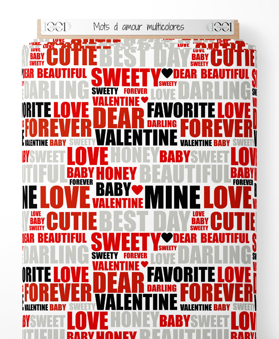 Les mots incluent 'LOVE', 'BABY', 'SWEETY' et 'VALENTINE'. Les couleurs principales sont le rouge, le noir et le gris.Les tissus