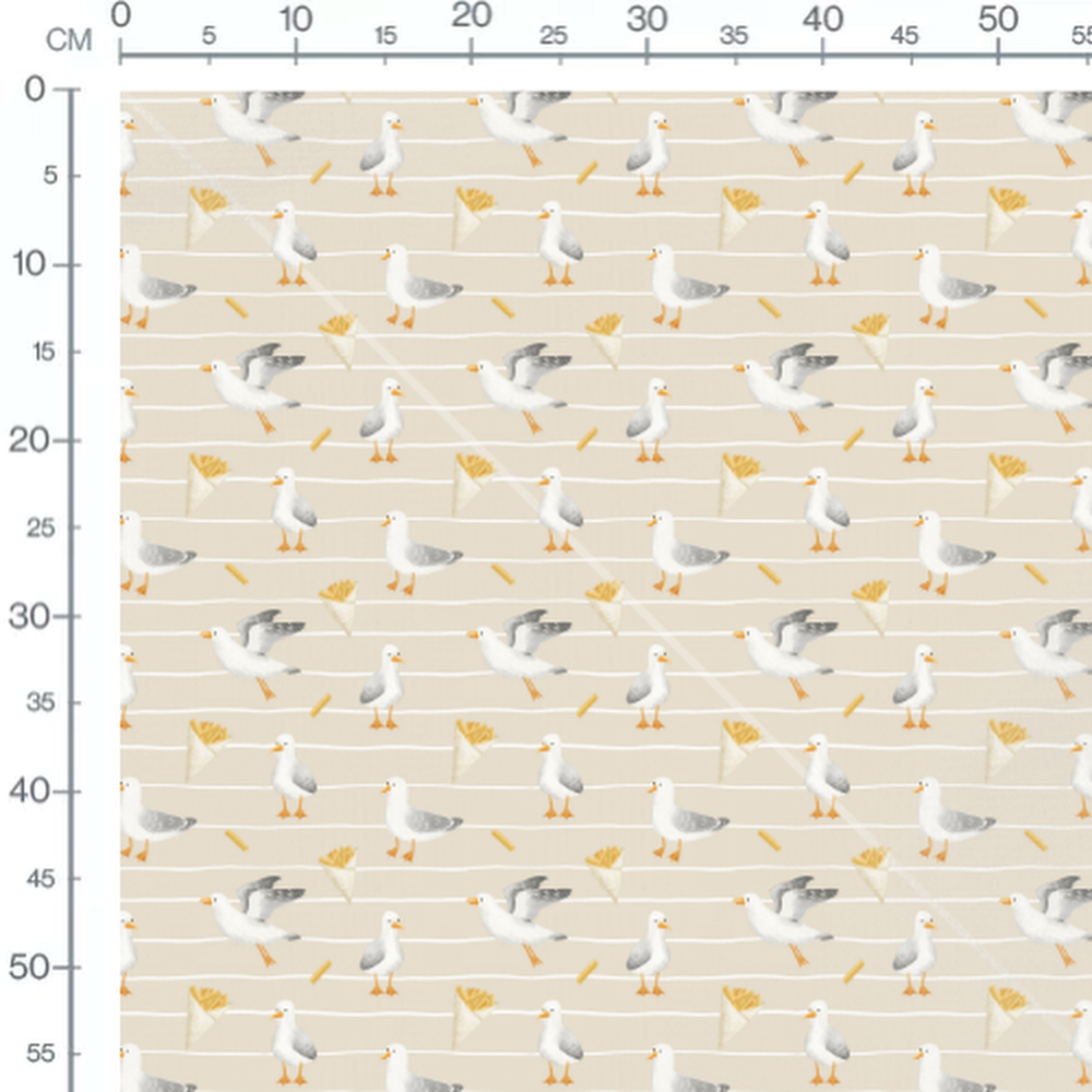 Les mouettes sont dessinées avec des détails réalistes. Les cornets de frites ajoutent une touche amusante au motif.Les tissus