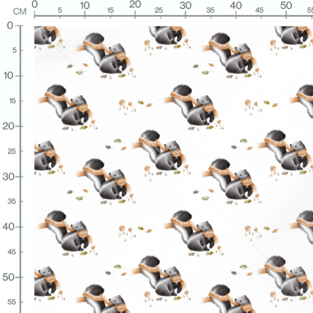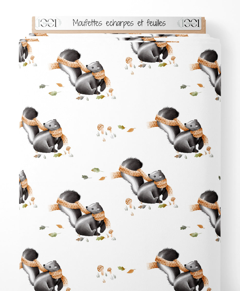 Les moufettes portent des écharpes à pois orange. Des feuilles vertes et brunes ainsi que des champignons complètent le motif.Les tissus