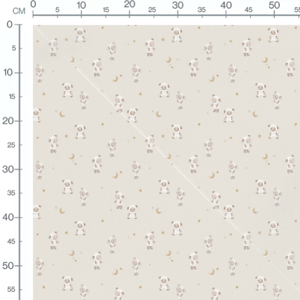 Les moutons sont dessinés avec des détails doux et des tons neutres. Les étoiles et les lunes ajoutent une touche céleste au motif. Le fond beige crée une ambiance apaisante et chaleureuse.Les tissus