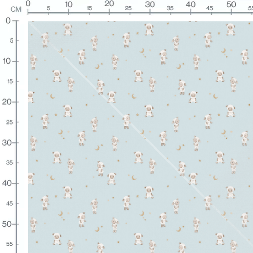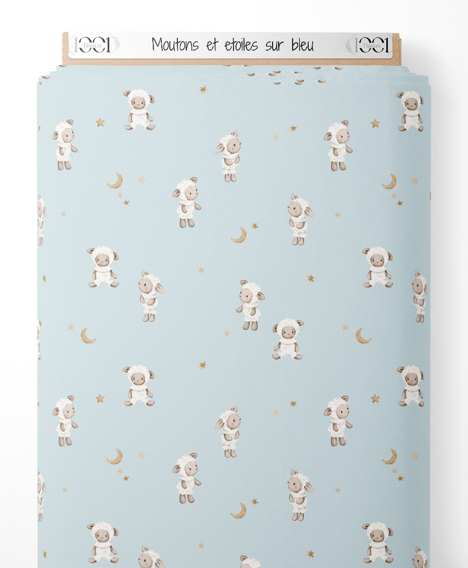 Les moutons sont dessinés avec des détails doux et enfantins. Les étoiles dorées ajoutent une touche de brillance au motif. Les lunes beige complètent le thème céleste. Le fond bleu clair crée une ambiance apaisante.Les tissus