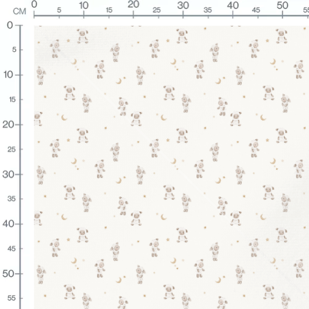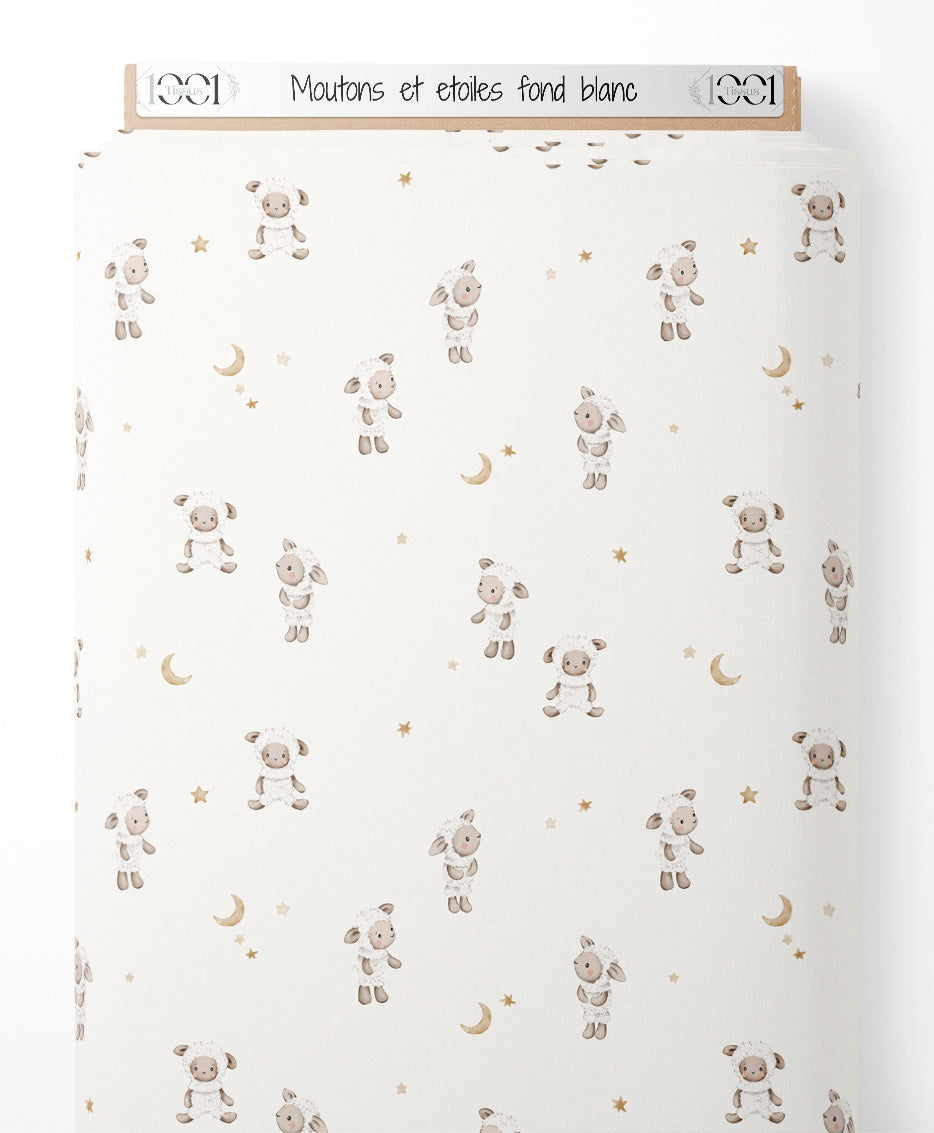 Les moutons sont dessinés avec des détails doux et des tons neutres. Les étoiles et les lunes ajoutent une touche céleste au motif. Le fond blanc met en valeur les éléments dessinés.Les tissus