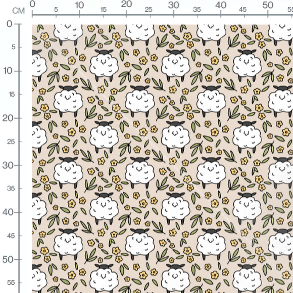 Les moutons sont dessinés avec des contours noirs et des visages souriants. Les fleurs jaunes sont petites et simples, ajoutant une touche de couleur. Les feuilles vertes sont de différentes tailles et formes, complétant le motif.Les tissus