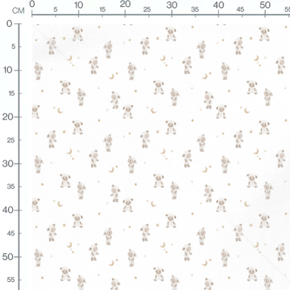 Les moutons sont dessinés avec des détails doux et enfantins. Les lunes et étoiles ajoutent une touche céleste au motif. Les couleurs beige et blanc créent une ambiance apaisante.Les tissus