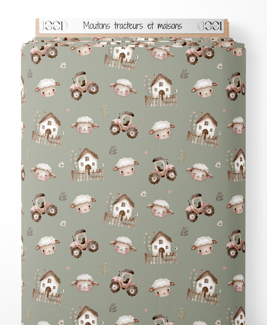 Les moutons ont des visages adorables et sont entourés de tracteurs de couleur rose. Les maisons blanches sont accompagnées de clôtures en bois et de petites fleurs délicates. Le fond vert ajoute une touche naturelle et apaisante à l'ensemble du motif.Les tissus