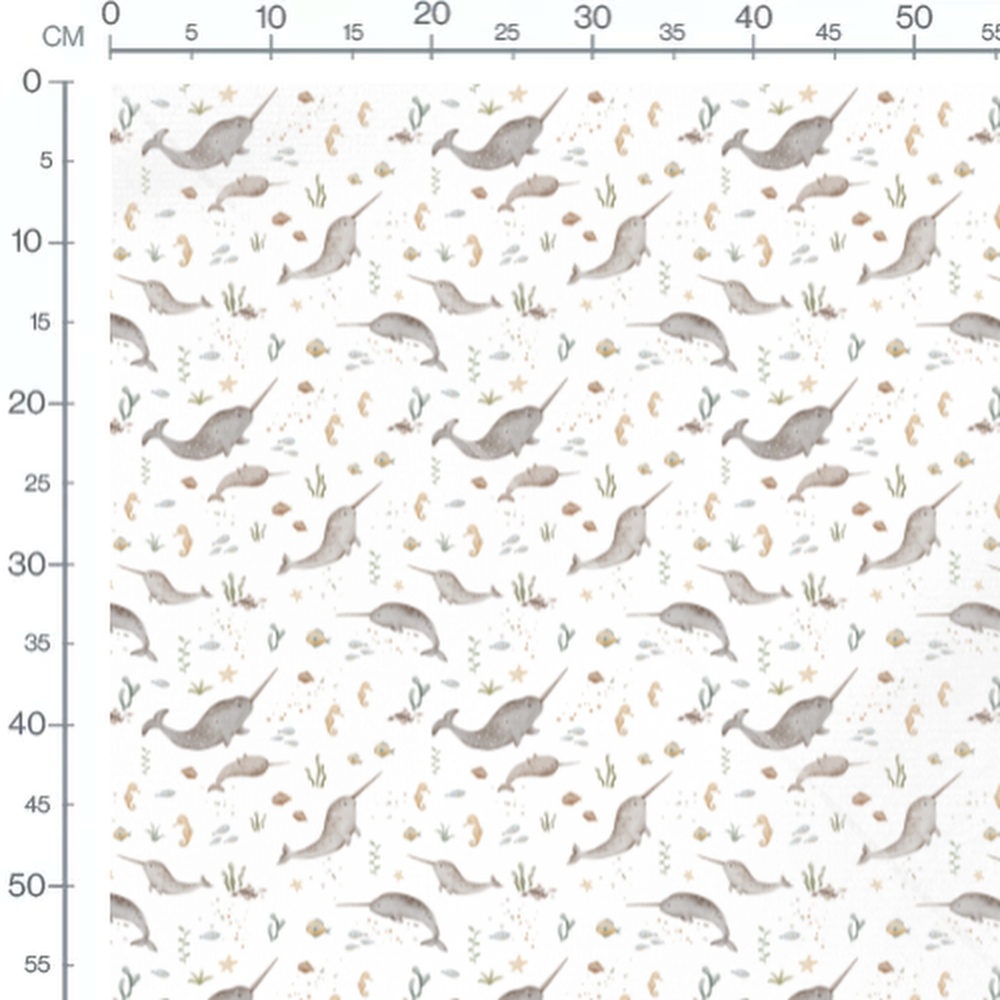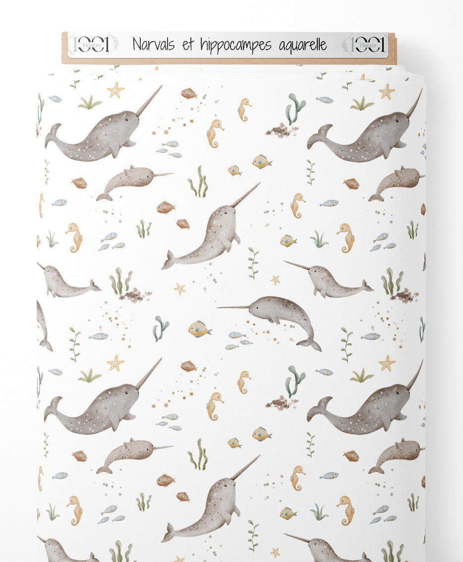 Étoiles de mer beige et petites bulles marron clair. Algues vertes et poissons bleus ajoutent des détails marins.Les tissus