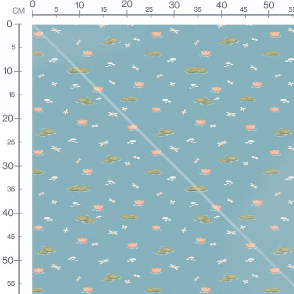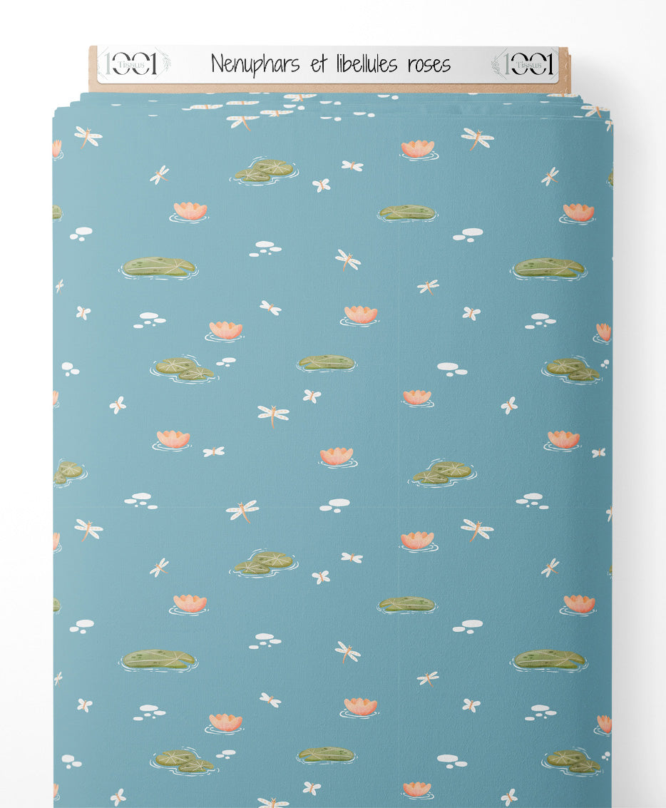 Les nénuphars flottent paisiblement sur l'eau. Les fleurs roses ajoutent une touche de couleur vive. Les libellules semblent danser au-dessus de l'étang. De petites ondulations entourent les éléments aquatiques.Les tissus