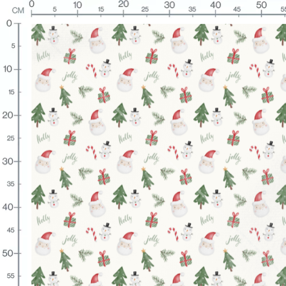 Les Pères Noël portent des chapeaux rouges. Les bonhommes de neige ont des chapeaux noirs et des écharpes rouges. Les cadeaux sont emballés en vert avec des rubans rouges. Les mots 'holly' et 'jolly' sont écrits en vert.Les tissus