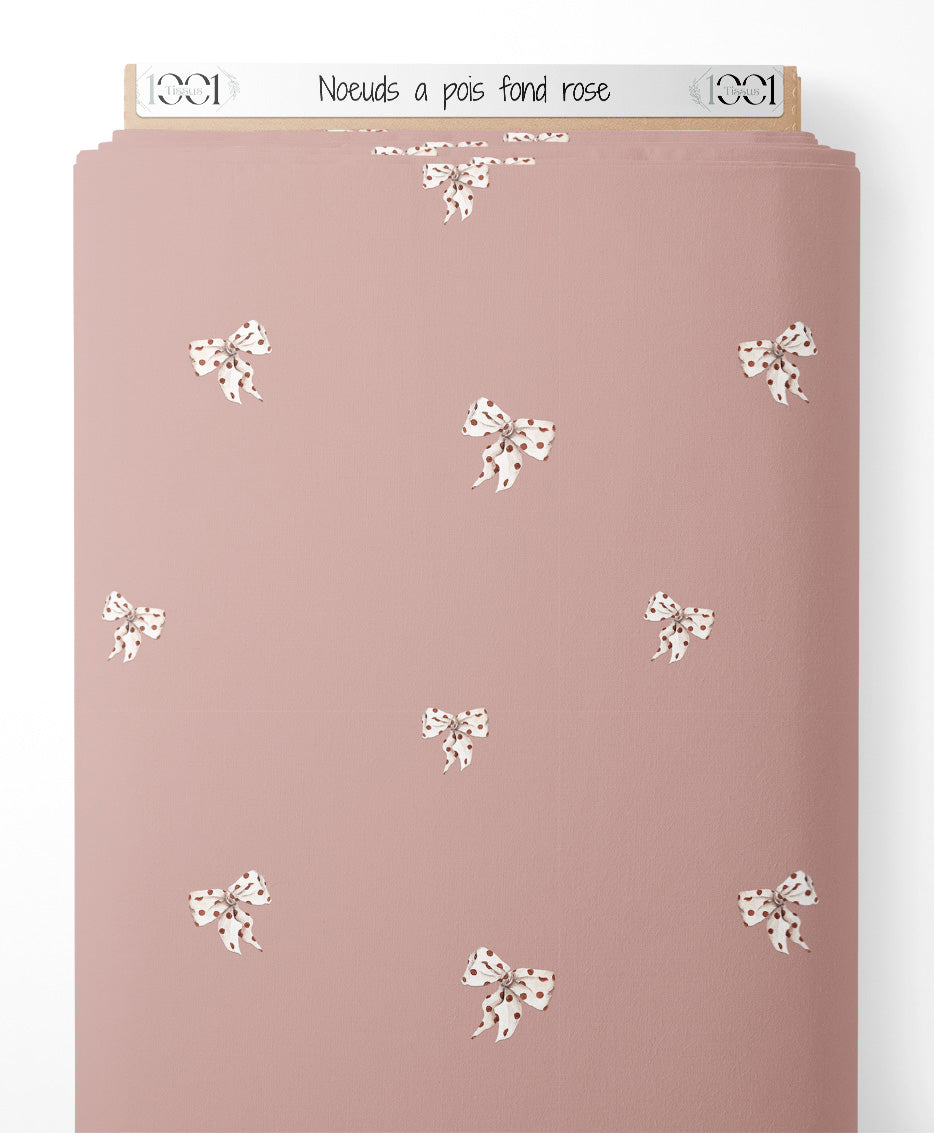 Les nœuds sont ornés de petits pois marron. Le fond rose offre un contraste doux avec les nœuds.Les tissus