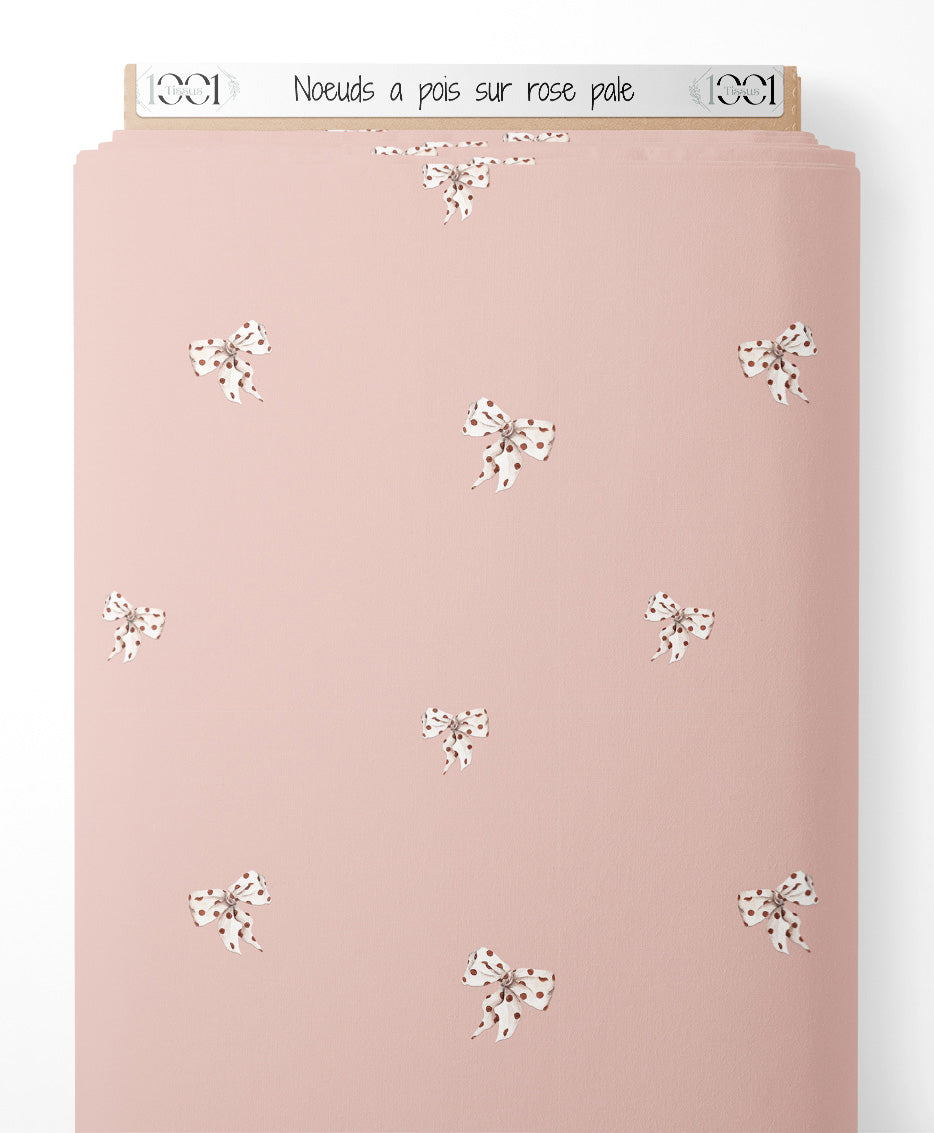 Les nœuds sont ornés de petits pois marron, ajoutant une touche ludique. Le fond rose pâle crée une ambiance douce et apaisante.Les tissus
