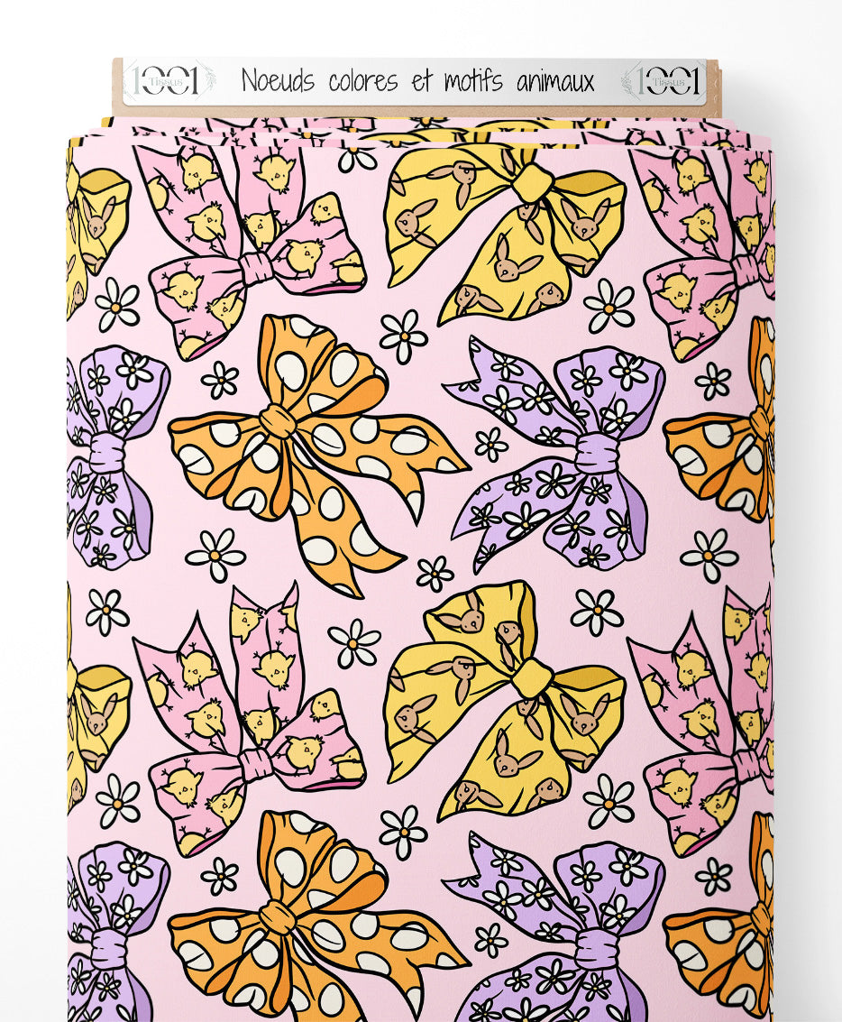 Les nœuds présentent des motifs de petits animaux jaunes et des pois blancs. Les couleurs des nœuds varient entre rose, orange et violet avec des motifs floraux.Les tissus