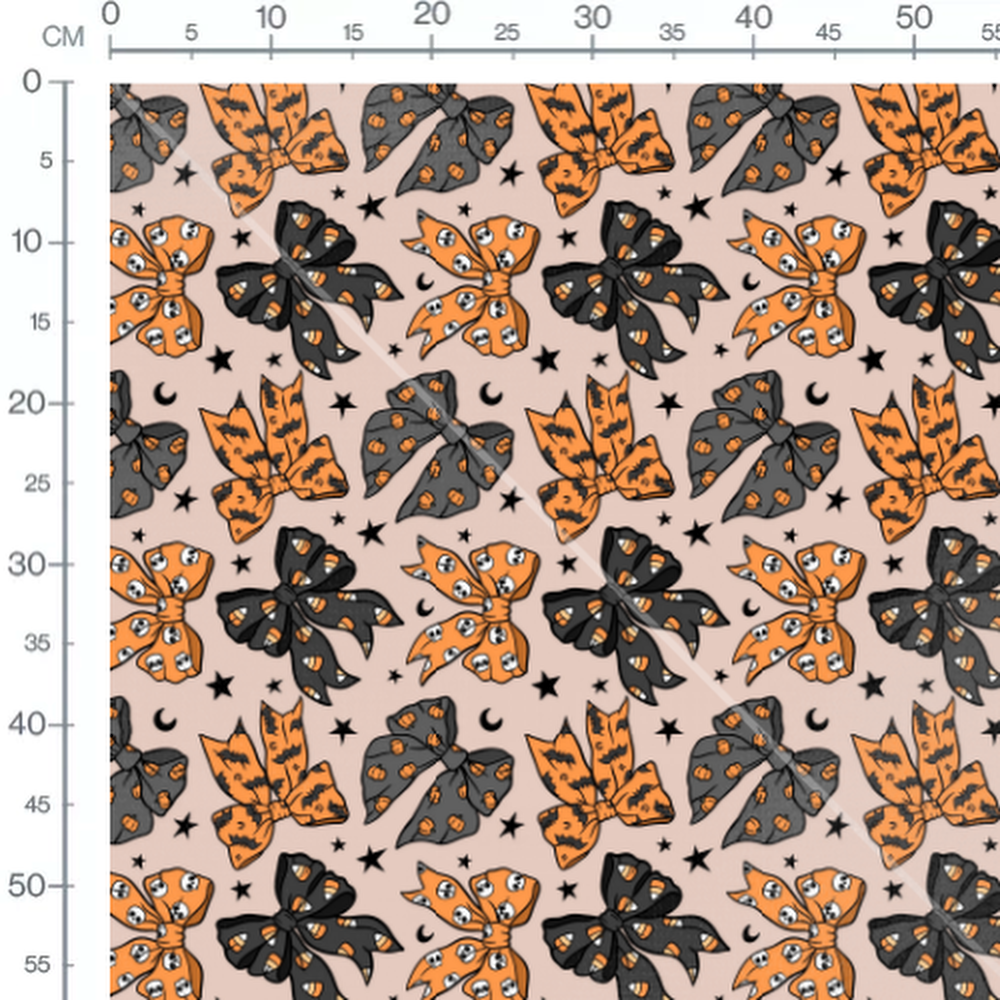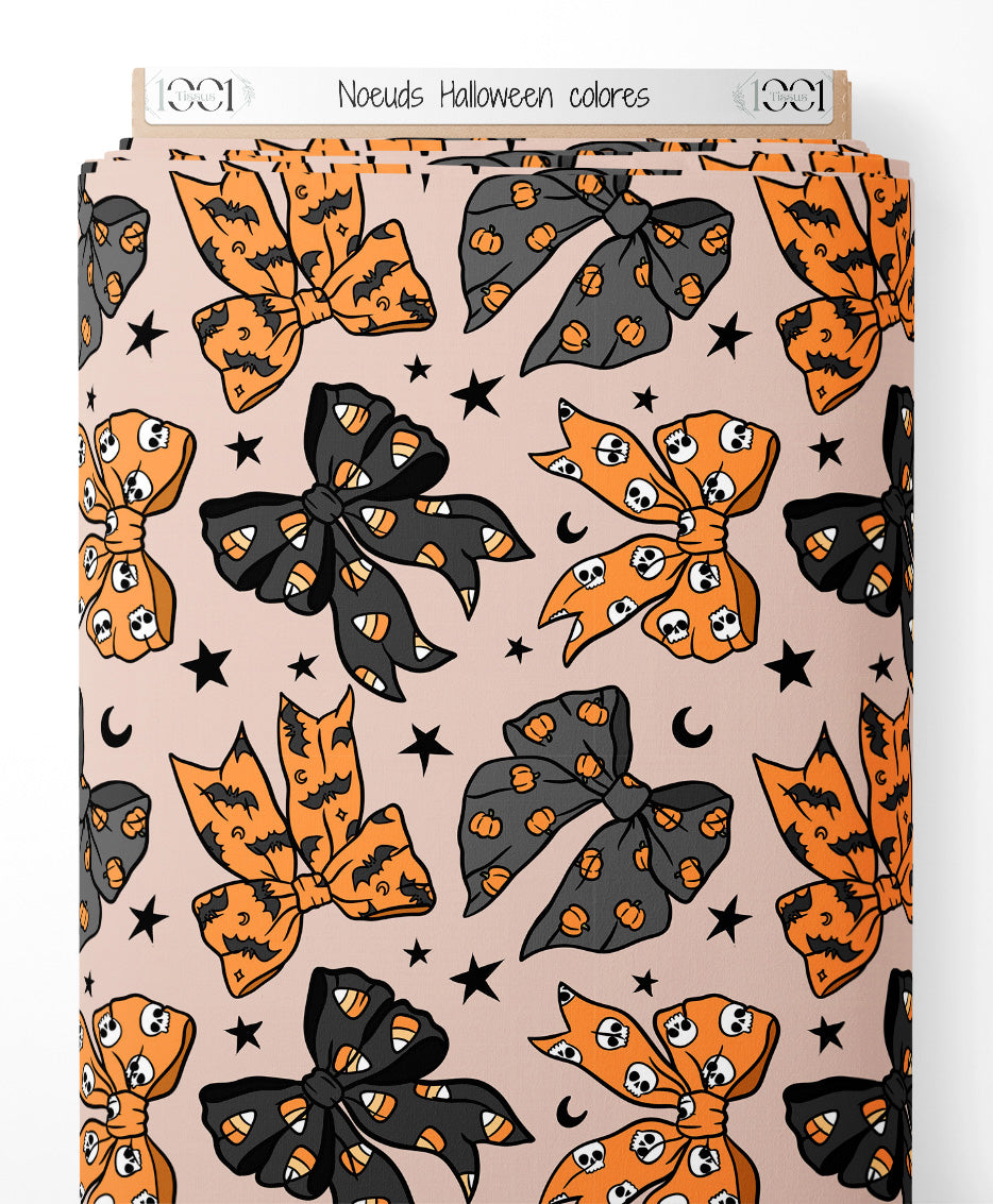 Les nœuds orange présentent des motifs de chauves-souris et de crânes blancs. Les nœuds noirs sont ornés de motifs de bonbons orange et blancs. Des étoiles et des lunes noires complètent le design sur un fond beige.Les tissus