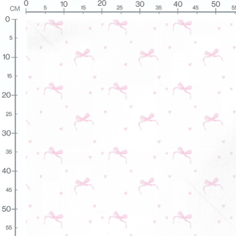 Les nœuds sont d'un rose doux et entourés de petits cœurs assortis. Le fond blanc met en valeur la délicatesse des motifs. Les cœurs sont dispersés de manière uniforme autour des nœuds.Les tissus
