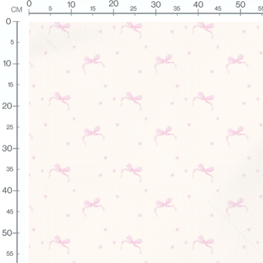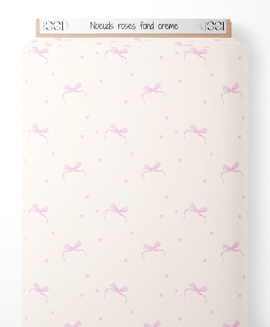 Les nœuds sont d'un rose doux et sont accompagnés de petits cœurs assortis. Le fond crème met en valeur la délicatesse du motif.Les tissus