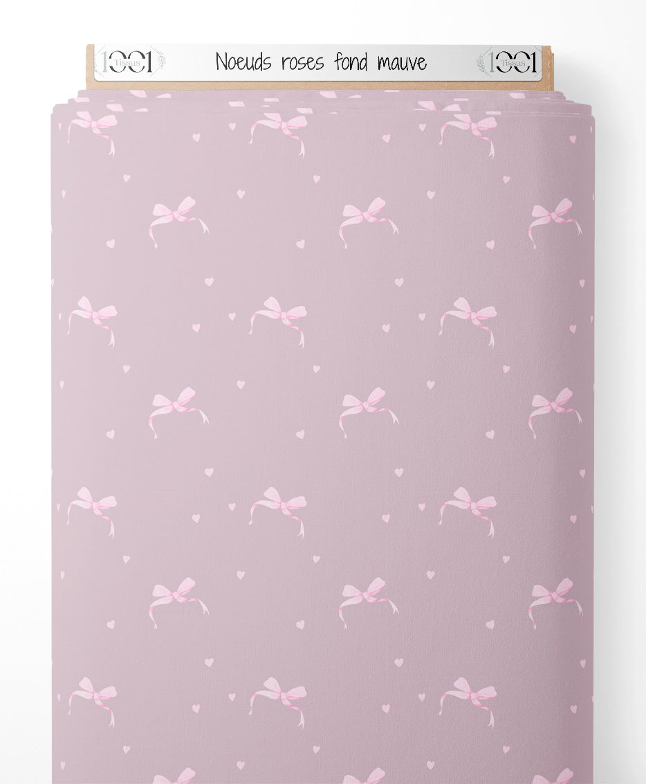 Nœuds roses sur fond mauve. Petits cœurs roses dispersés.Les tissus