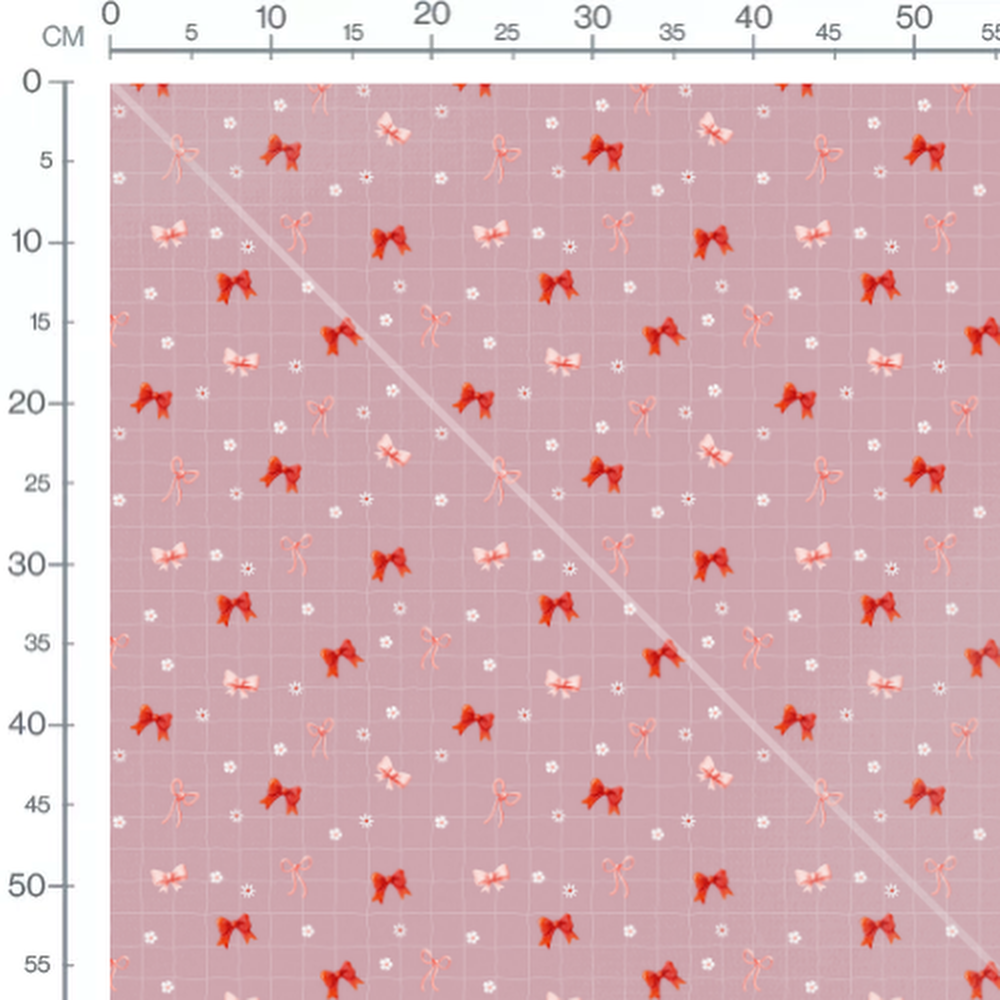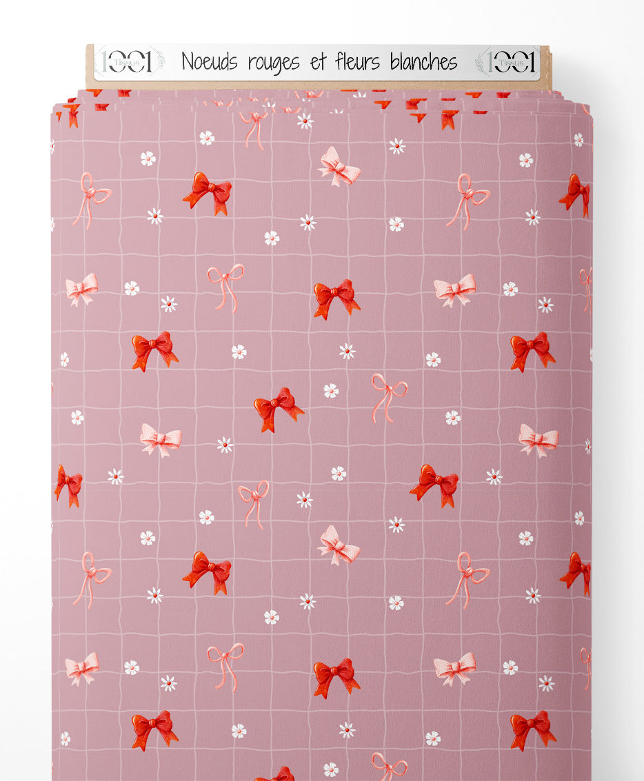 Les nœuds rouges et roses apportent une touche élégante au motif. Les petites fleurs blanches ajoutent un contraste délicat. Le fond quadrillé rose donne une structure subtile à l'ensemble.Les tissus
