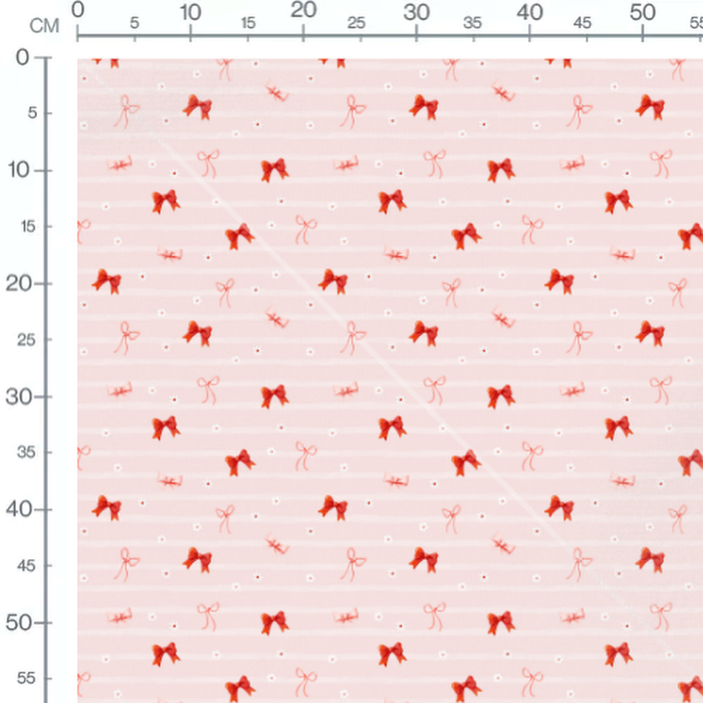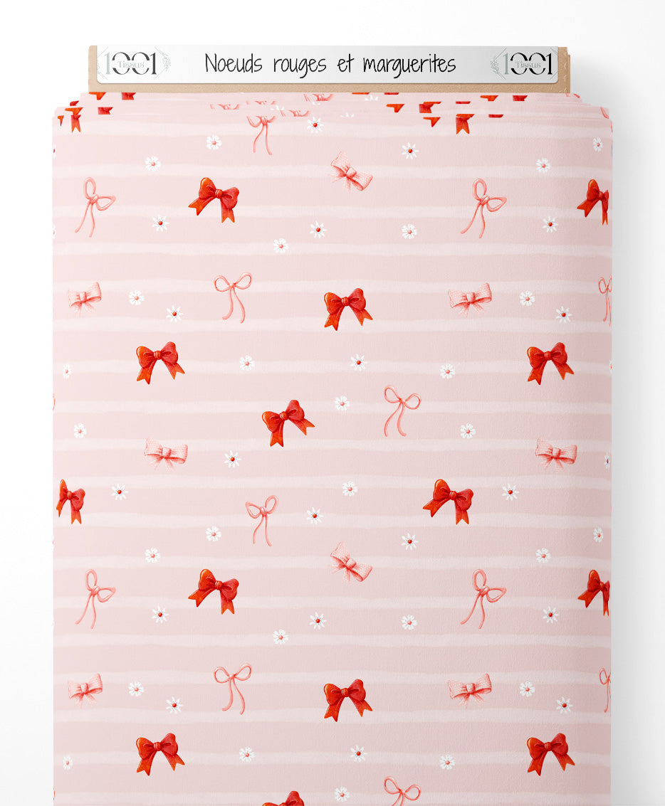 Les nœuds rouges sont accompagnés de nœuds roses plus clairs. Les marguerites blanches ajoutent une touche florale délicate.Les tissus
