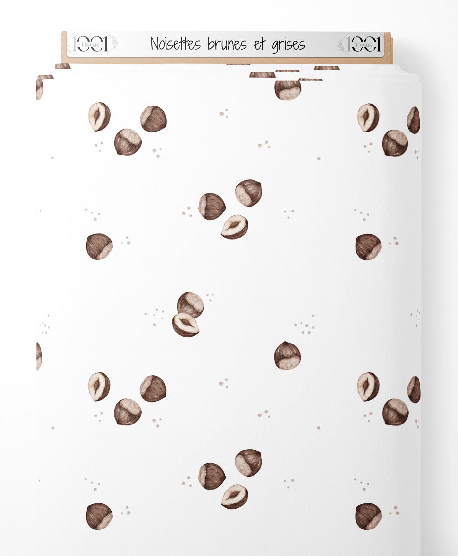 Les noisettes sont représentées entières et coupées en deux. Les taches grises ajoutent un léger contraste au fond blanc.Les tissus