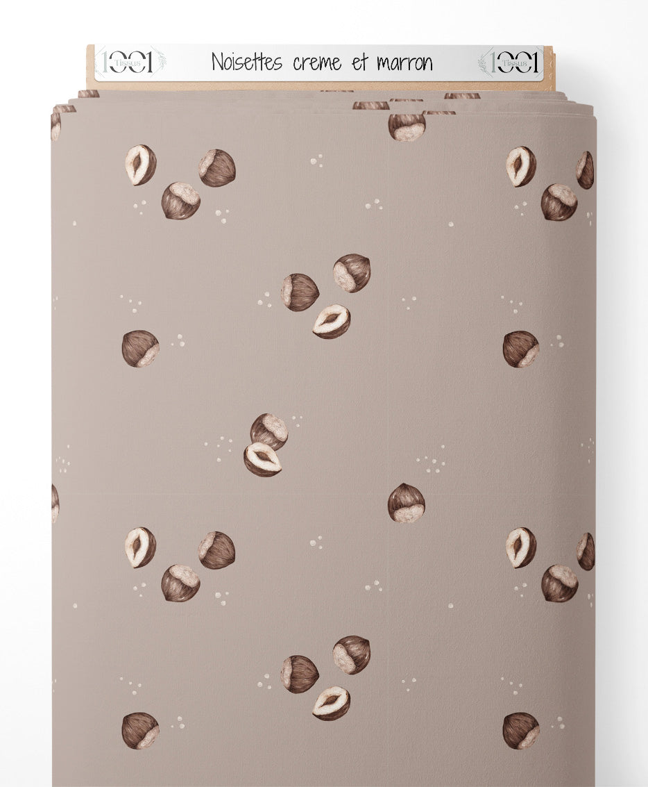 Les noisettes sont illustrées en marron et crème. Le fond beige met en valeur les détails des noisettes. Les petits points blancs ajoutent une texture subtile.Les tissus