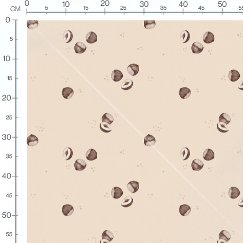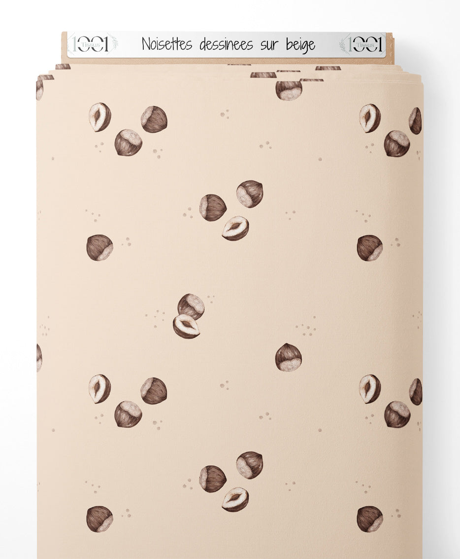 Les noisettes sont représentées entières et ouvertes. Le fond beige met en valeur les dessins marron des noisettes.Les tissus