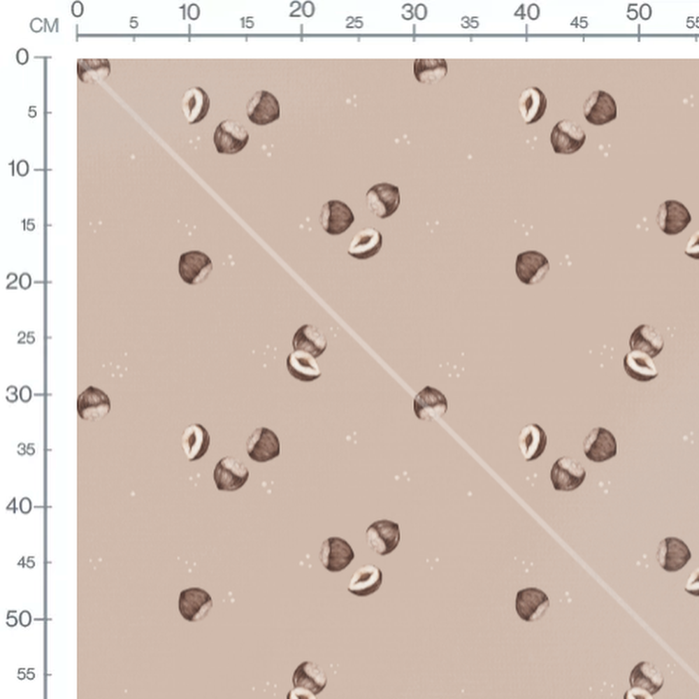 Les noisettes sont dessinées en marron avec des détails réalistes. Le fond beige met en valeur les motifs de noisettes et les points blancs ajoutent une touche de contraste.Les tissus