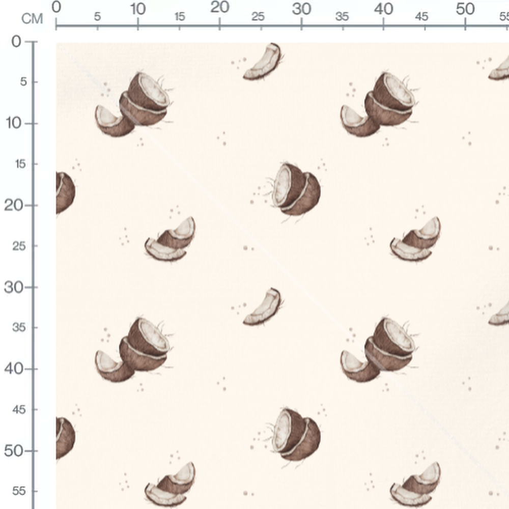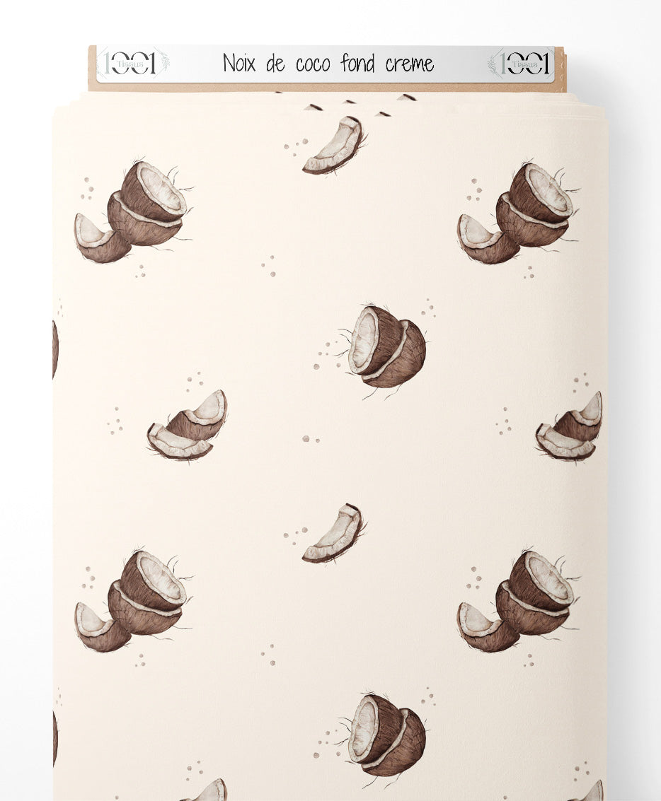 Les noix de coco sont illustrées en morceaux avec des détails réalistes. Le fond crème met en valeur les nuances marron et blanc des noix de coco.Les tissus