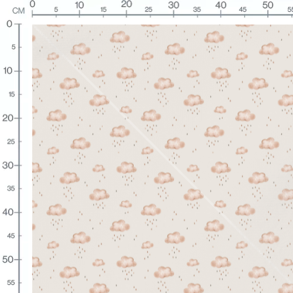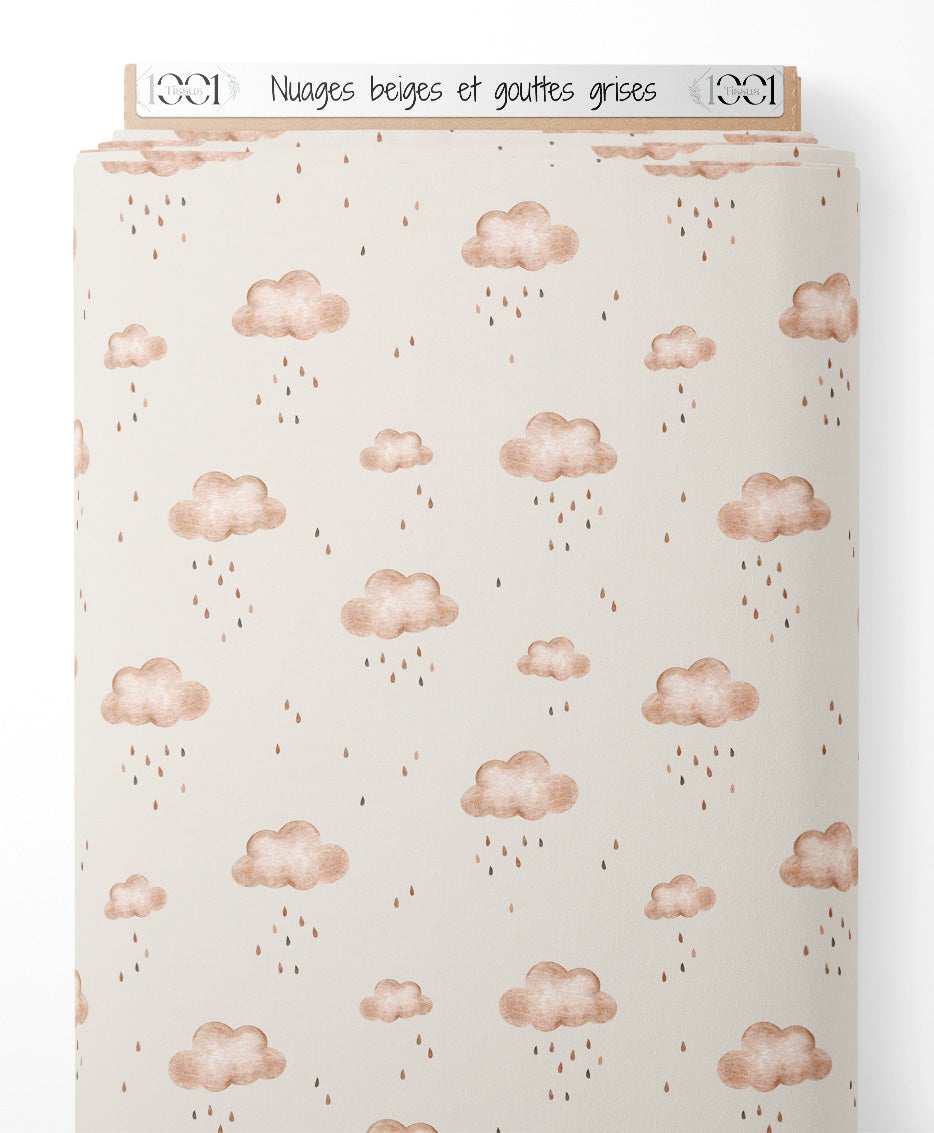 Les nuages sont légèrement texturés avec des nuances de beige. Les gouttes de pluie varient entre le marron et le gris, ajoutant une touche subtile au motif.Les tissus