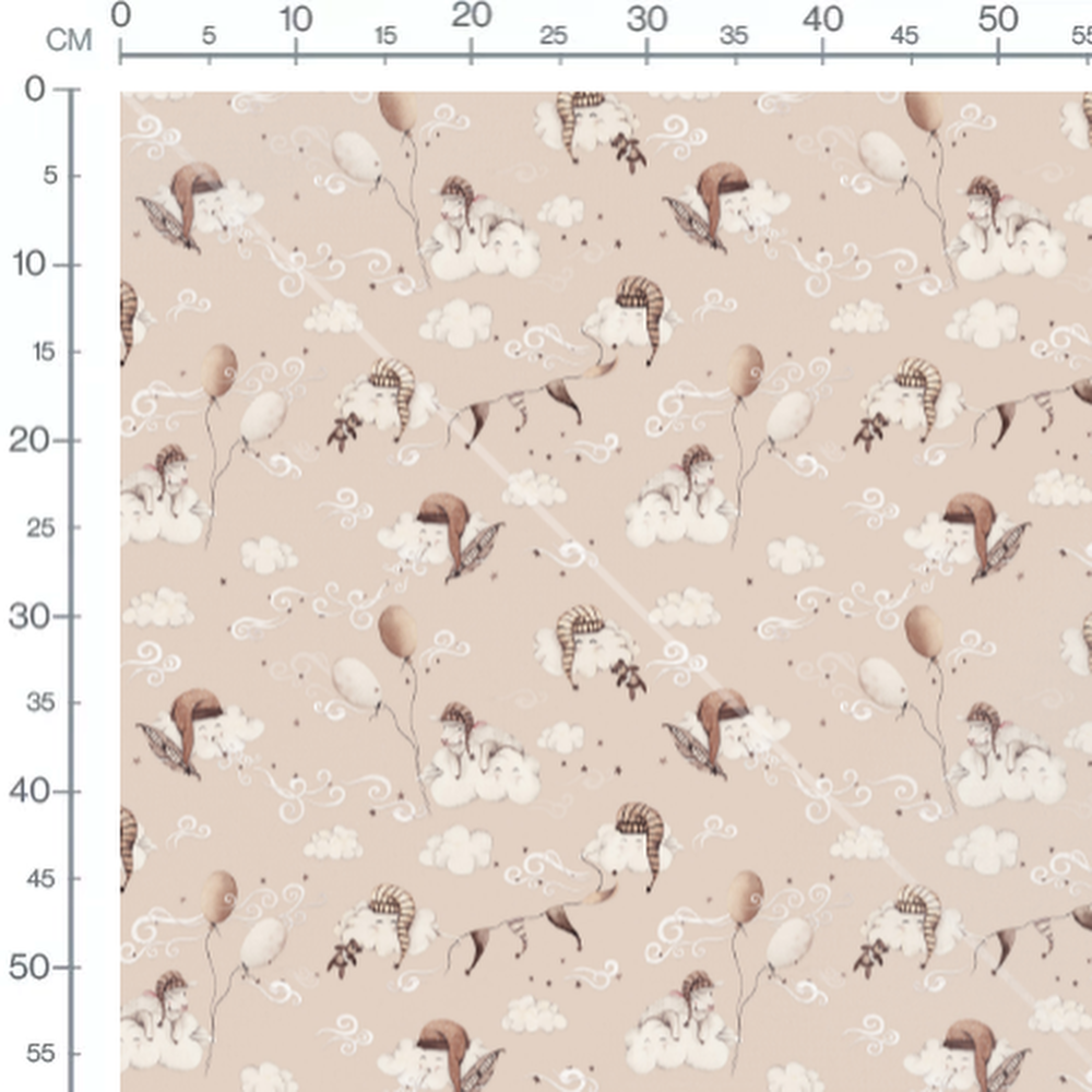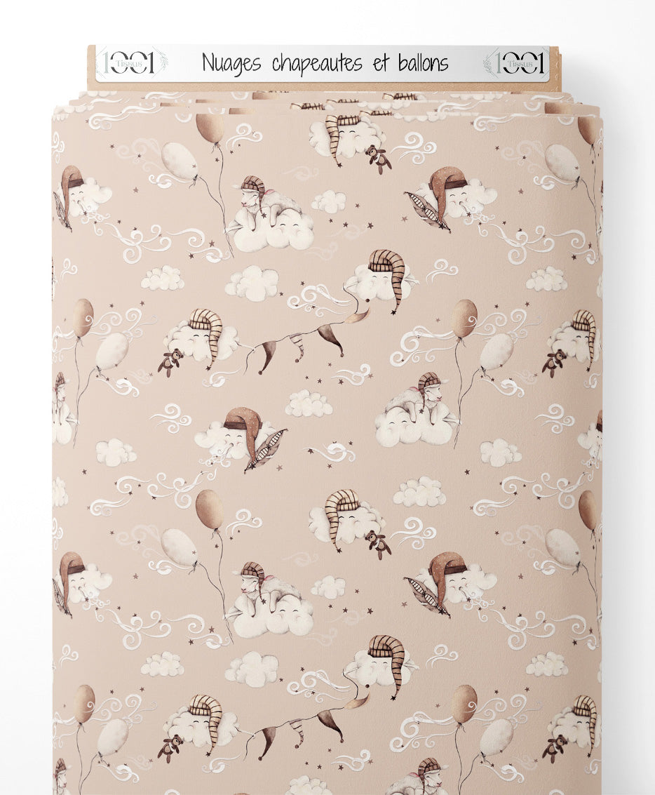 Les nuages portent des chapeaux et tiennent des ballons. Des étoiles et des volutes blanches ajoutent une touche onirique. Les ballons sont de différentes teintes douces. Les nuages semblent souffler des volutes de vent.Les tissus