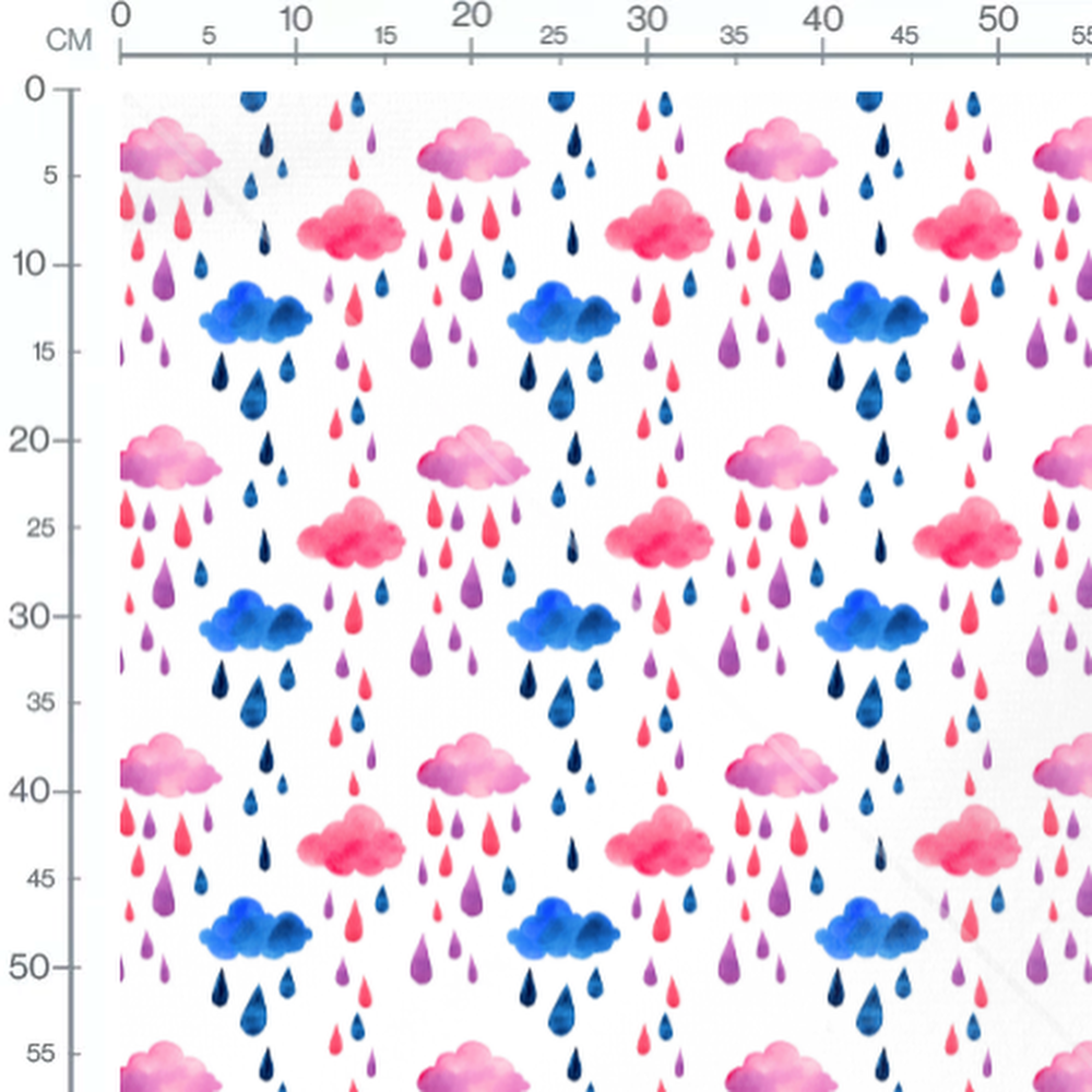 Les nuages sont peints dans des teintes de rose et de bleu. Les gouttes de pluie varient entre le bleu, le rose et le violet, créant un motif vibrant.Les tissus