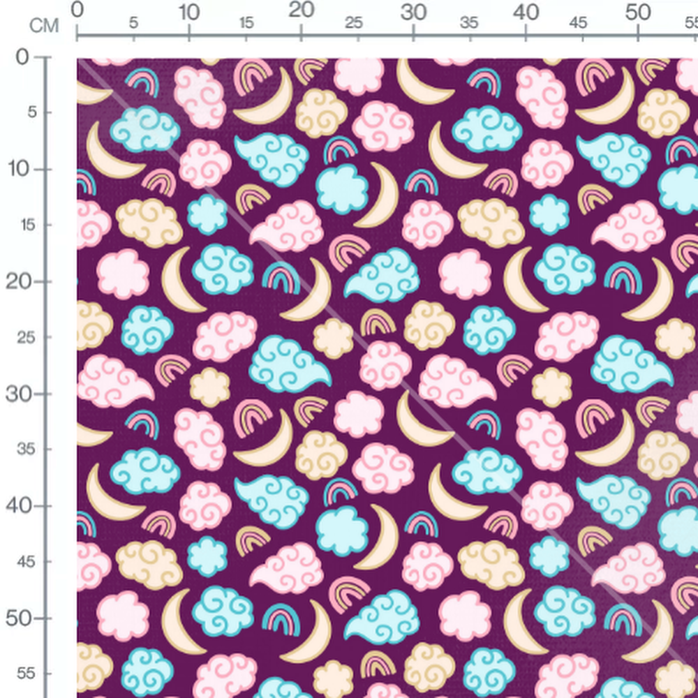 Les nuages sont de différentes formes et couleurs, ajoutant une touche de fantaisie. Les arcs-en-ciel sont stylisés avec des teintes douces. Les lunes jaunes apportent une harmonie au design général.Les tissus