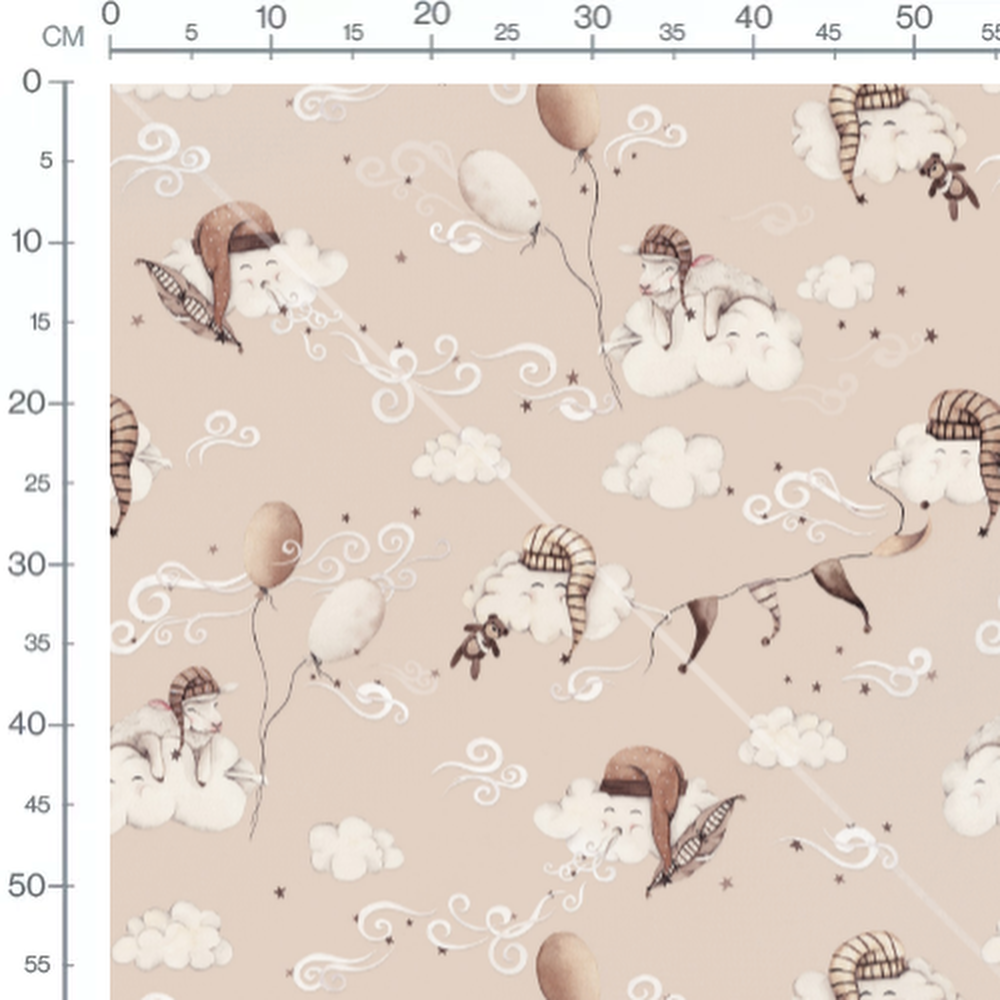Les nuages portent des bonnets rayés et soufflent des volutes blanches. Des ballons flottent parmi les nuages endormis. De petites étoiles ajoutent une touche de magie au motif.Les tissus