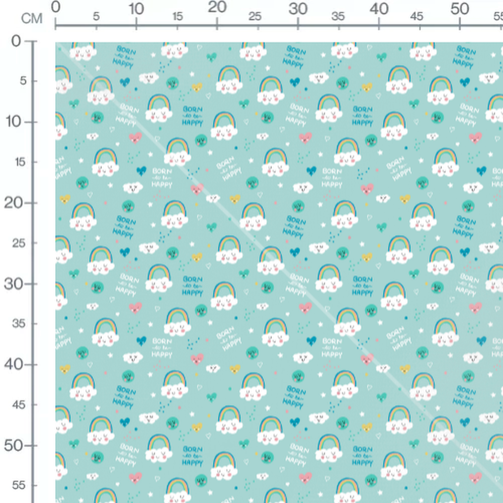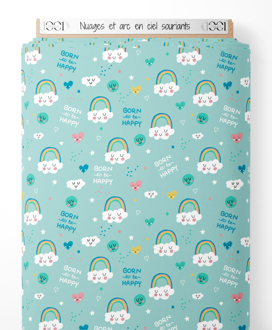 Des inscriptions 'Born to be happy' accompagnent les motifs. Petits visages souriants sur des cercles colorés. Petits cœurs et étoiles ajoutent une touche ludique.Les tissus