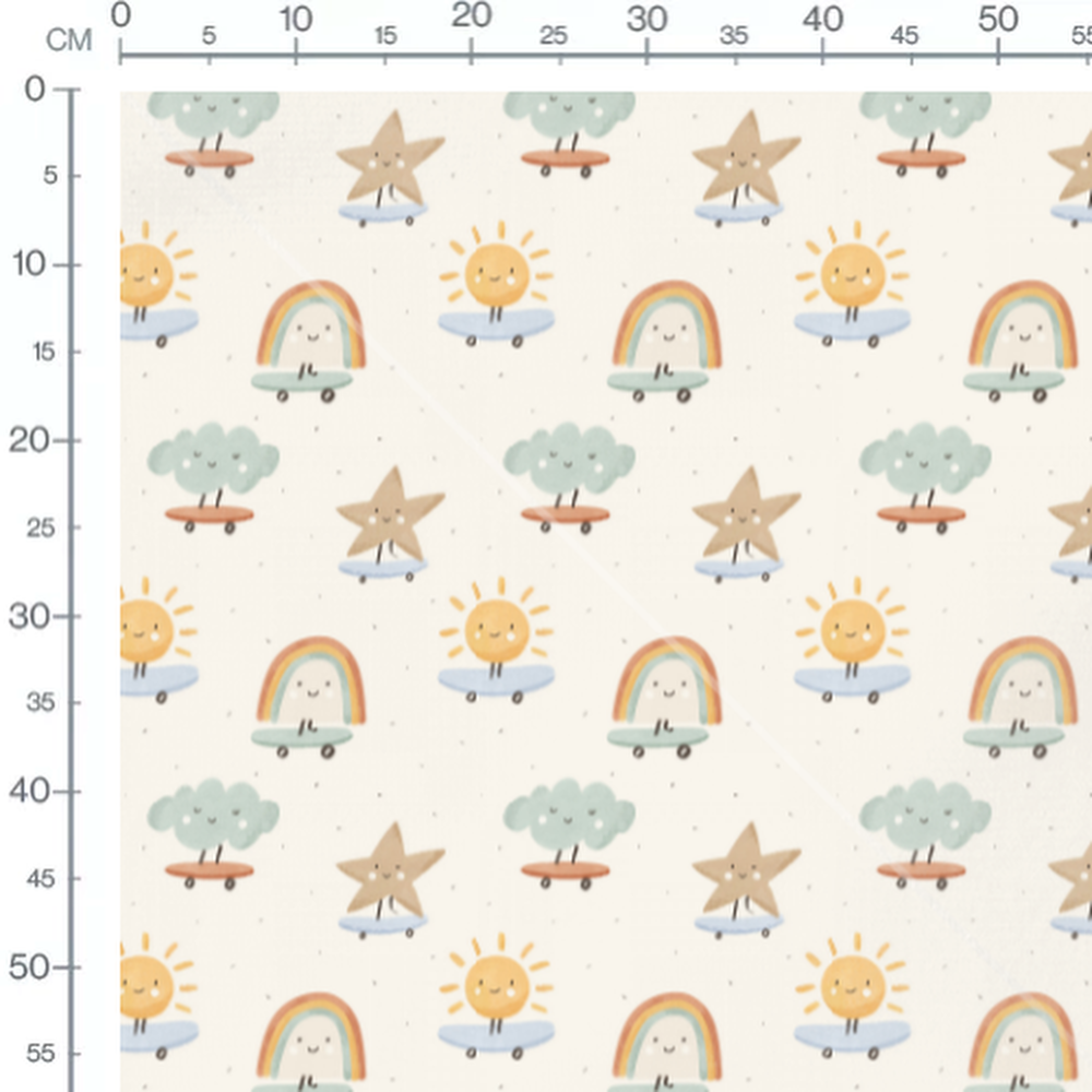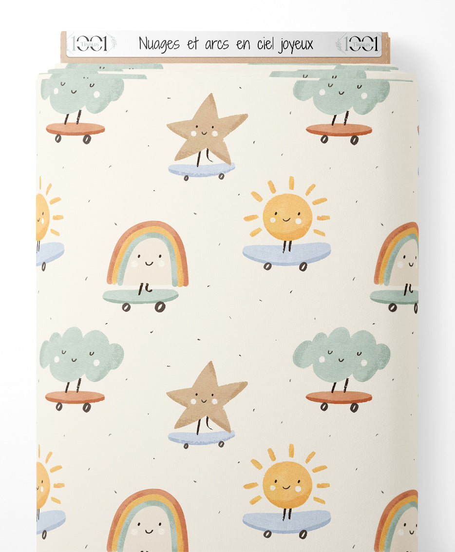 Les étoiles et les nuages sont accompagnés de petits arcs-en-ciel. Les soleils ajoutent une touche lumineuse avec leurs rayons jaunes. Chaque élément est dessiné avec un visage souriant, créant une ambiance joyeuse.Les tissus