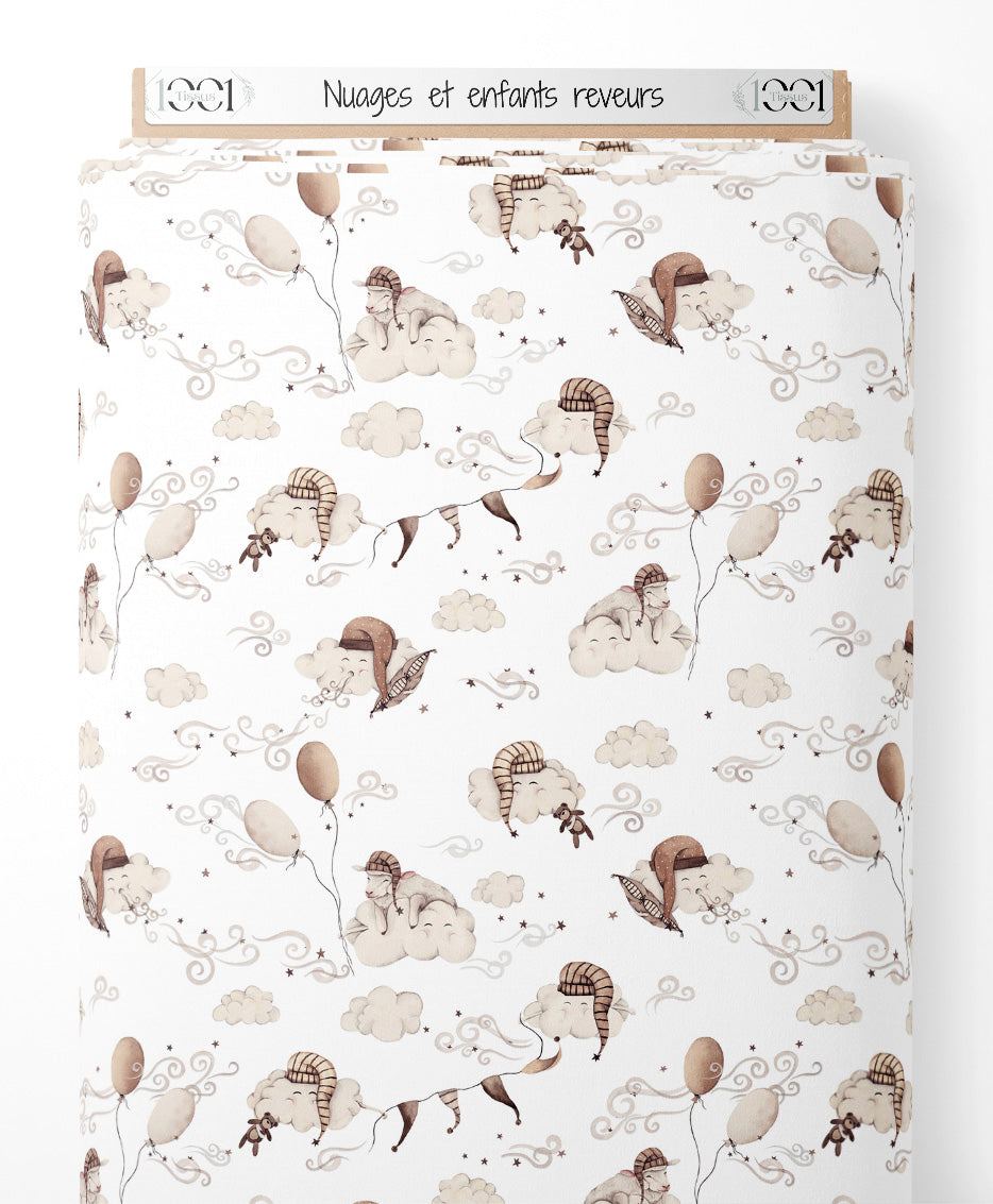 Les enfants portent des bonnets rayés marron et beige. Des volutes de vent beige entourent les nuages. De petites étoiles marron parsèment le fond blanc.Les tissus