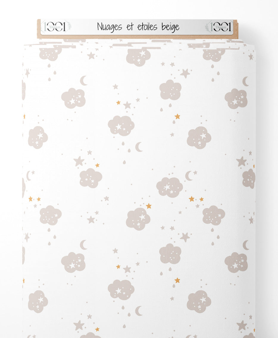 Gouttes de pluie grises dispersées autour des nuages. Étoiles de différentes tailles en gris et orange. Croissants de lune ajoutant une touche céleste au motif.Les tissus