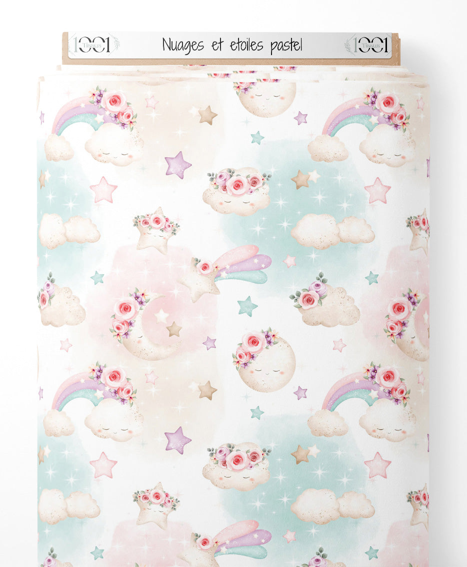 Les nuages sont ornés de petites fleurs roses. Les étoiles et lunes sont décorées de motifs floraux délicats. Des arcs-en-ciel pastel ajoutent une touche de couleur douce. Le fond est un mélange de teintes pastel apaisantes.Les tissus