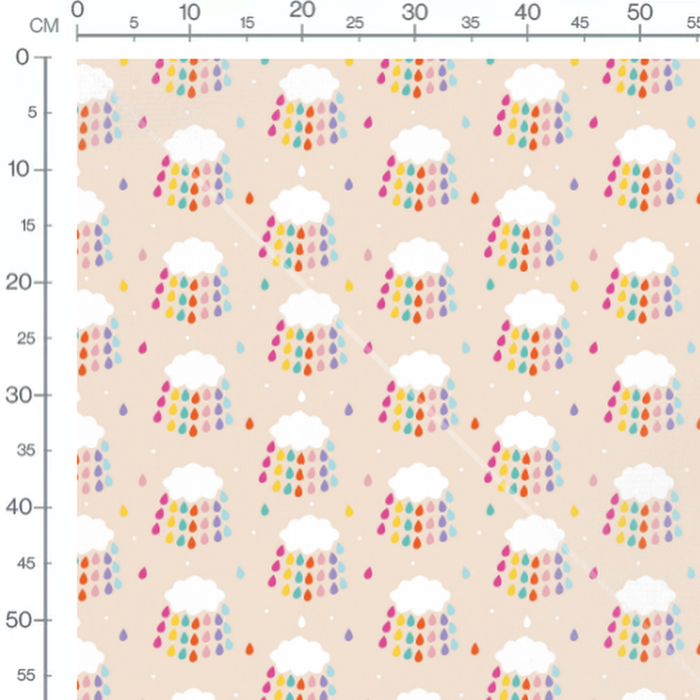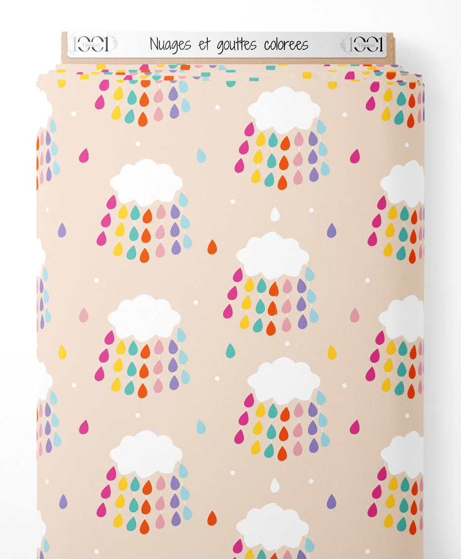 Les nuages sont dispersés uniformément sur le fond. Les gouttes de pluie varient en couleur, ajoutant une touche vive au motif. Le fond beige crée un contraste doux avec les couleurs vives des gouttes.Les tissus