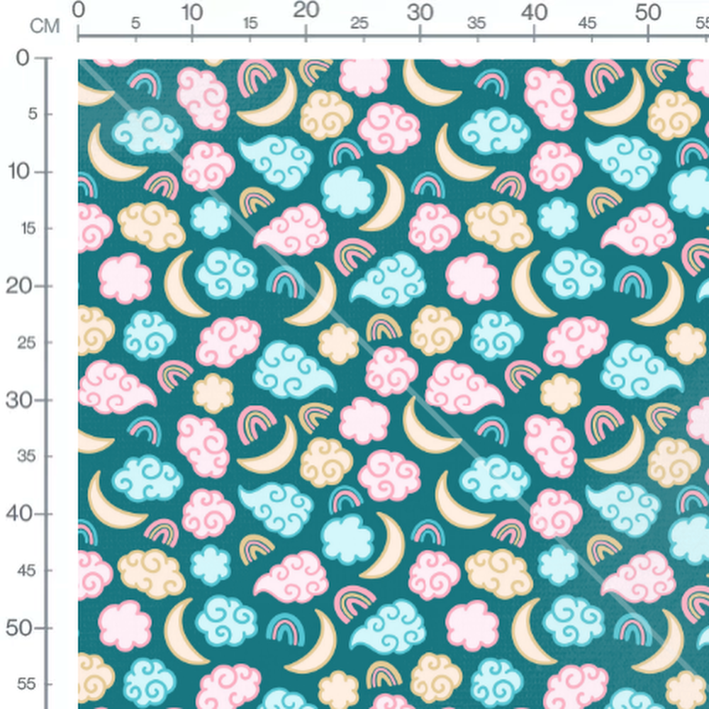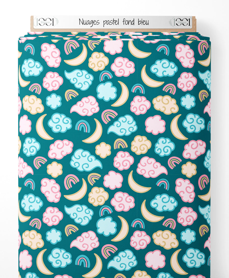 Les nuages sont de différentes formes et couleurs, incluant le rose, le bleu et le beige. Les arcs-en-ciel sont stylisés avec des teintes pastel. Les lunes sont d'un jaune doux, ajoutant une touche de rêve au motif.Les tissus