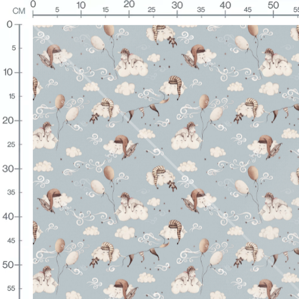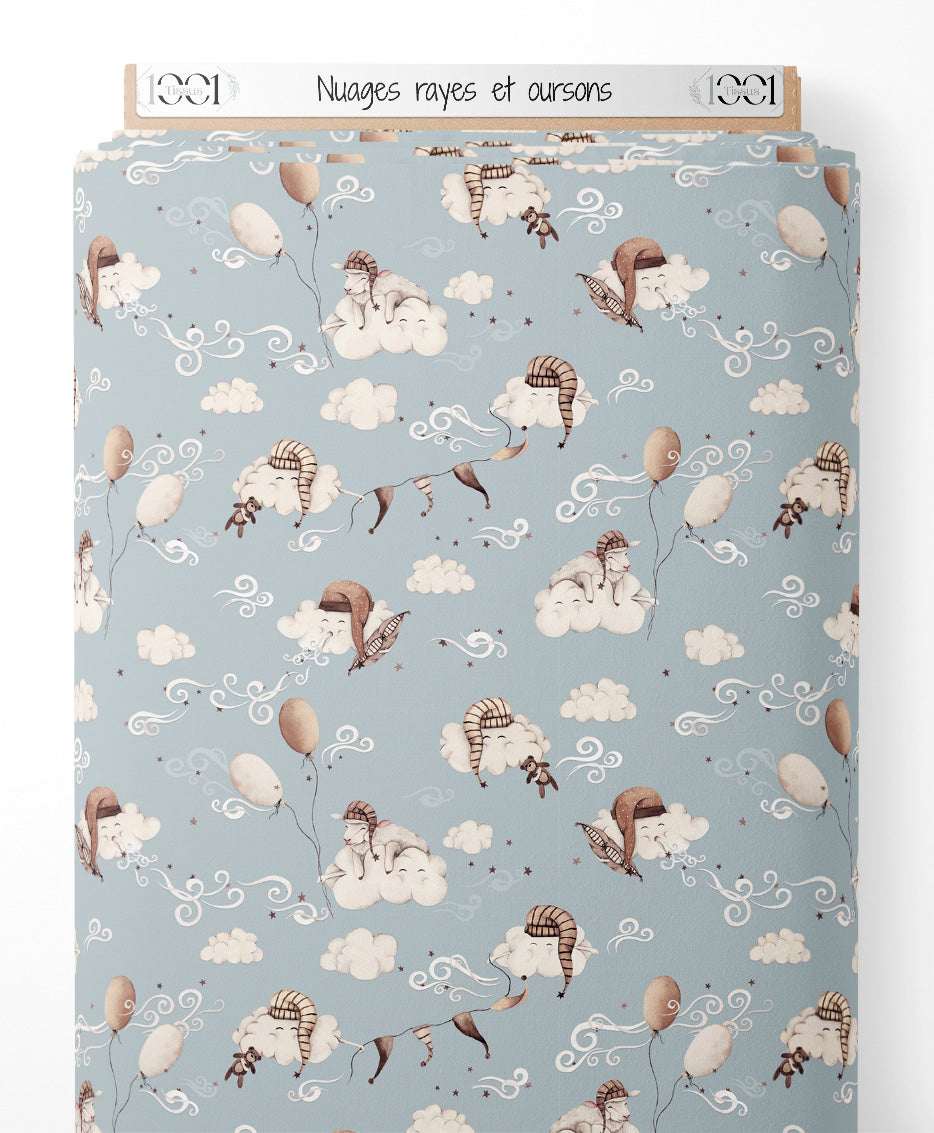 Les nuages portent des bonnets rayés et semblent souffler des vents doux. Des ballons flottent parmi les étoiles et les nuages. De petits oursons sont accrochés aux nuages. Des motifs de vent tourbillonnant ajoutent une touche de mouvement.Les tissus