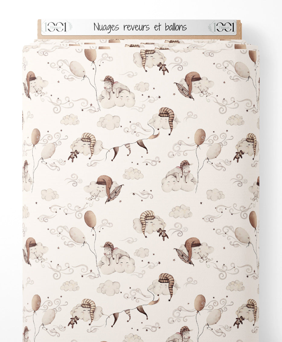 Les nuages portent des bonnets rayés et semblent souffler des volutes. Des ballons flottent parmi les étoiles et les nuages. Les couleurs sont douces et pastel, principalement dans les tons de beige et brun clair.Les tissus