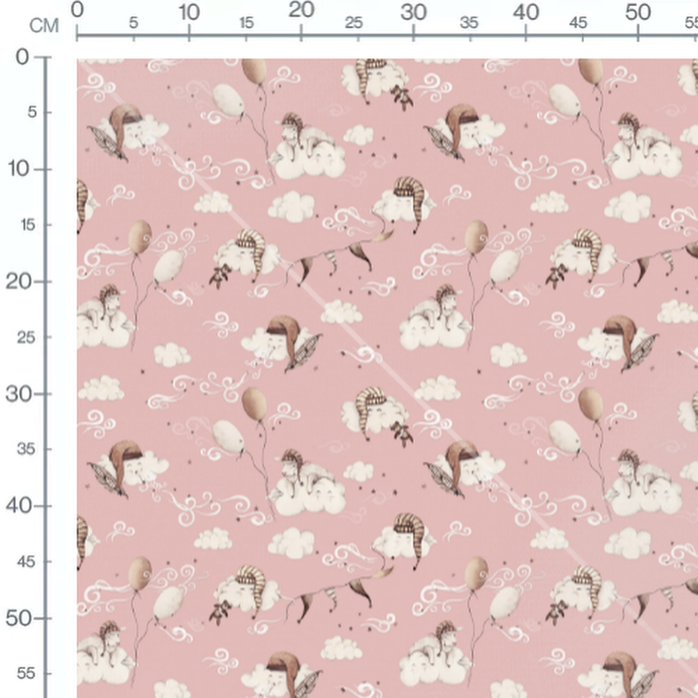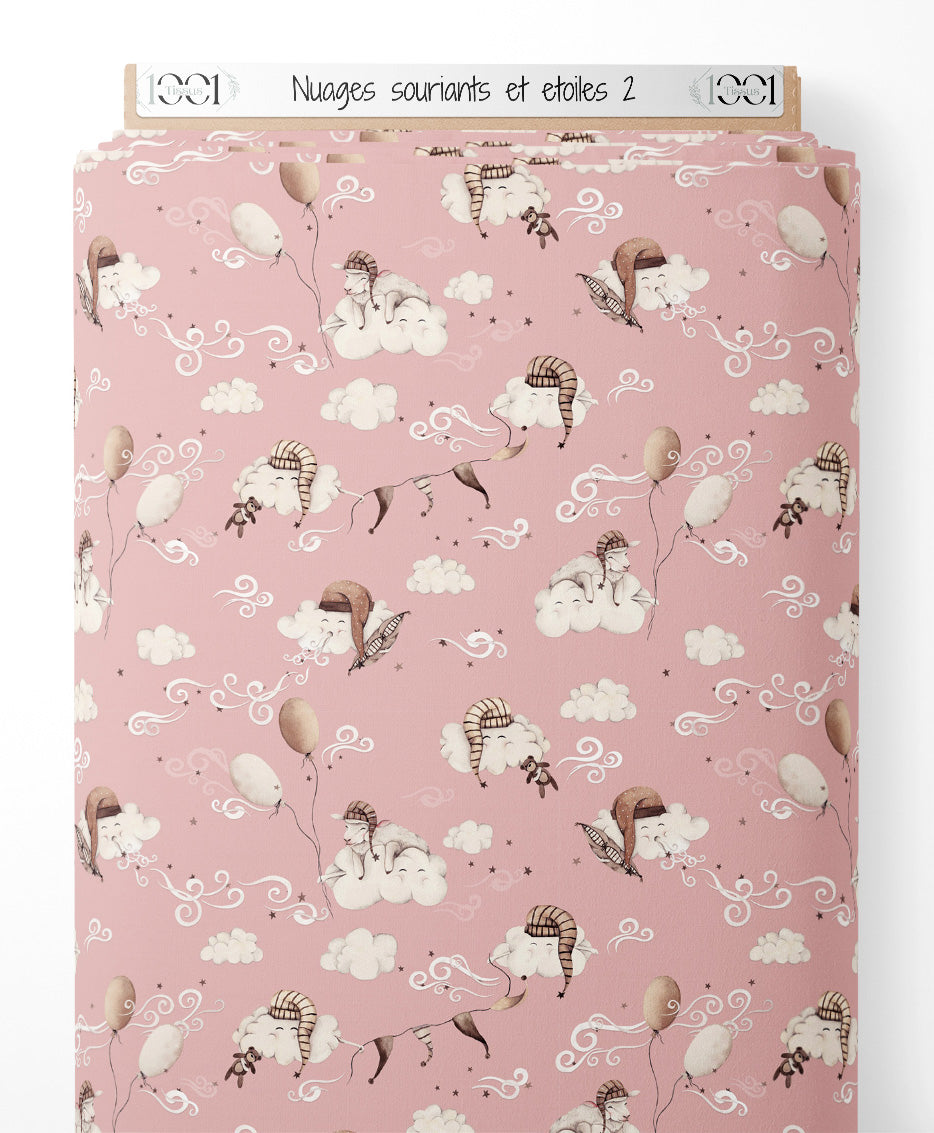Les nuages portent des chapeaux rayés et dorment paisiblement. Les ballons flottent doucement parmi les étoiles. Des volutes blanches ajoutent une touche de rêve au motif.Les tissus