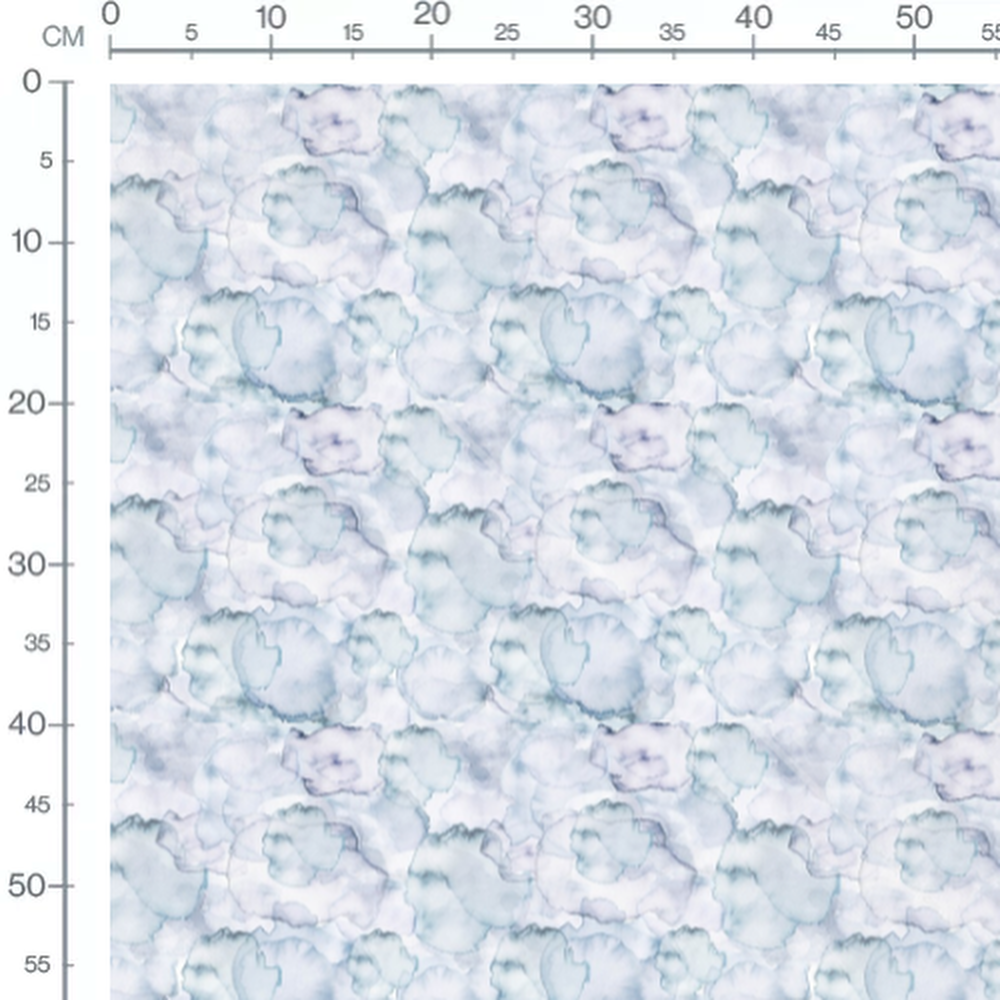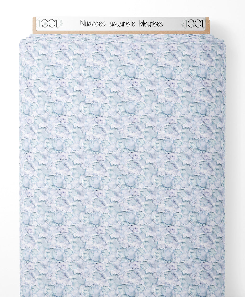 Les taches aquarelle se fondent les unes dans les autres créant un effet de profondeur. Les nuances varient du bleu clair au gris, apportant une sensation de calme. Le fond blanc accentue la légèreté du motif.Les tissus