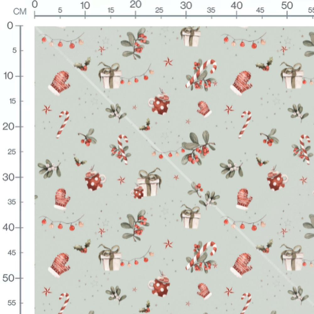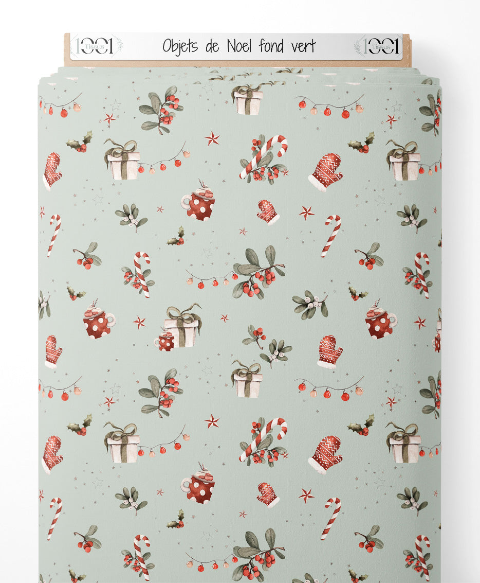 Guirlandes lumineuses et étoiles rouges dispersées. Branches de houx avec baies rouges. Tasses à pois blancs et cannes à sucre rayées.Les tissus